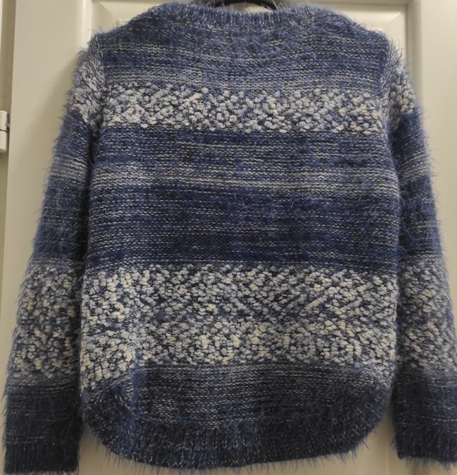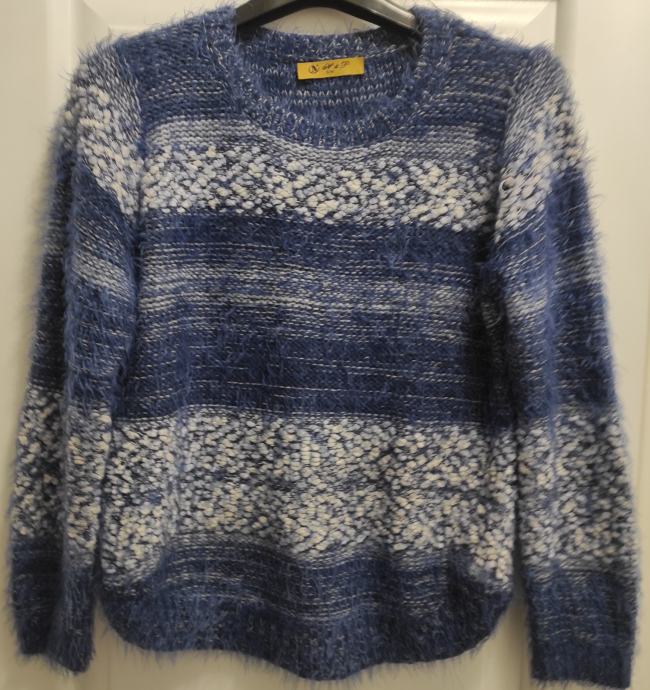 Prodajem ženski džemper, veličina S/M, nošen malo puta, boja plavo bijela, veoma mekan i udoban. Kao nov, bez oštećenja i tragova nošenja. Duljina pulovera je 55 cm, duljina rukava je 60 cm.