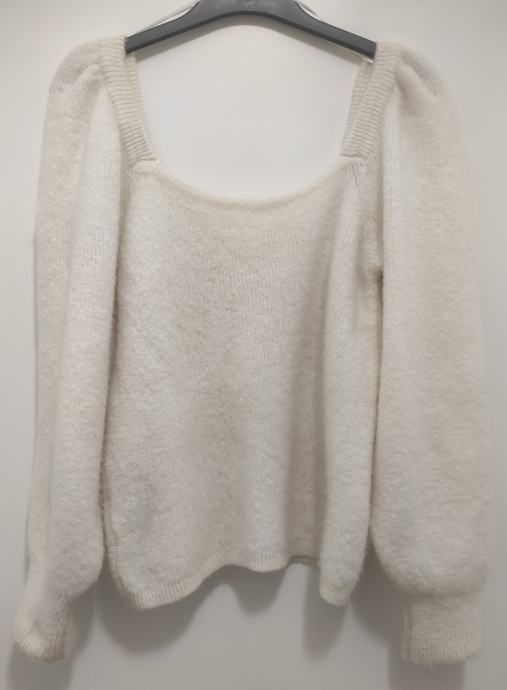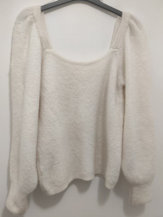 Prodajem ženski pleteni pulover s puf rukavima i četvrtastim izrezom s prednje i stražnje strane, veoma mekan i ugodan za nošenje. Veličina L, nikad nošen, samo isprobane, s etiketom. Kupljen u Mangu. Duljina pulovera mjerena od ramena je 70 cm (jos se dodatno rasteže).