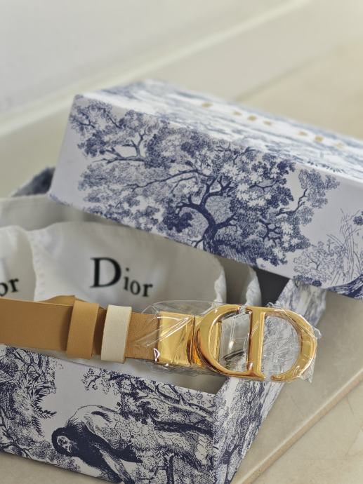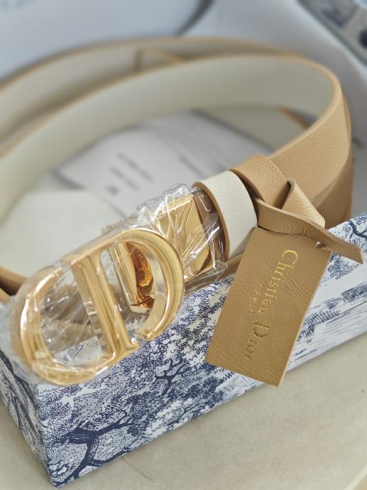 Prodajem novi Christian Dior ženski kožni remen. Remen je bež boje s prepoznatljivom zlatnom "CD" kopčom. Izrađen je od kože, a dužina iznosi 105 cm.