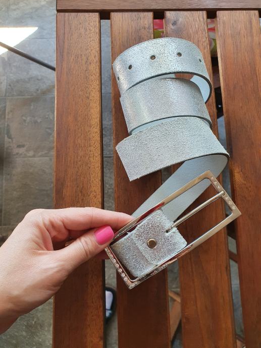 3. Srebrni također od prave kože, dužina cca 105 cm, 111 cm sa kopčom, debljina 4 cm. 20 kn