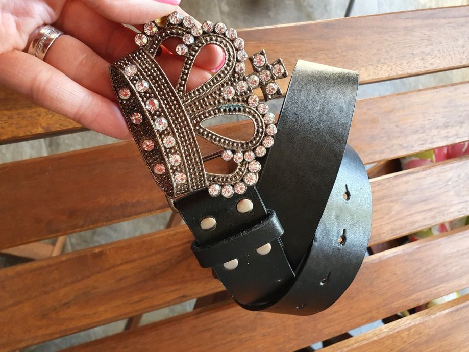 7. Crni od umjetne kože sa crnom krunom ( ispao 1 cirkon), dužina cca 97 cm, 104 cm sa kopčom, debljina 4 cm. 10 kn