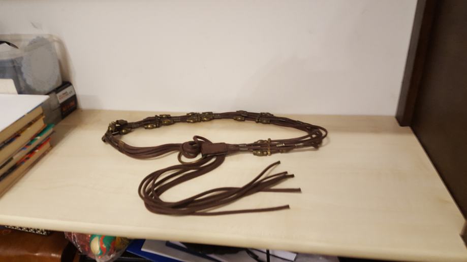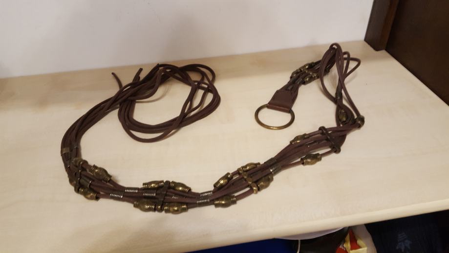 Zanimljiv smeđi pojas , kombinacija dugačkih pamučnih traka, kože i metalnih dijelova kojima su trake spajane i ukrašene. Dugačak 140cm, širine cca 3cm. Metalni dijelovi mu daju na težini pa pojas, kad se zaveže, vrlo lijepo pada i djeluje vrlo efektno. Korišten je svega nekoliko puta, u jako dobrom je stanju. Cijena 8€+ trošak dostave.