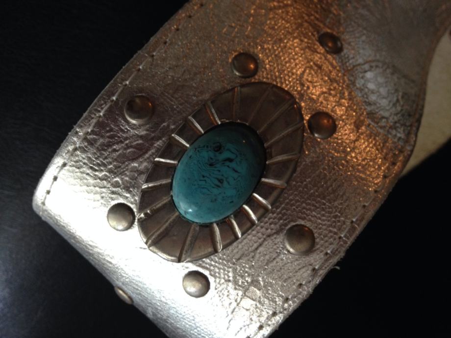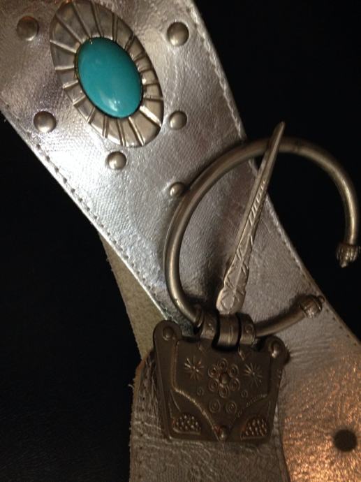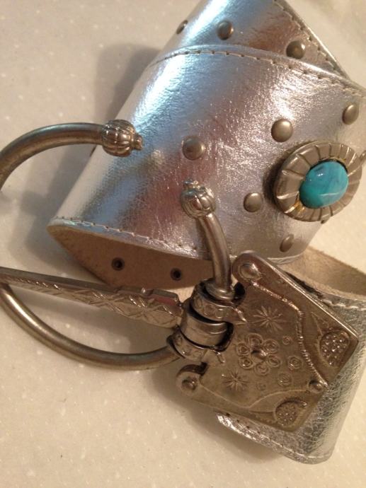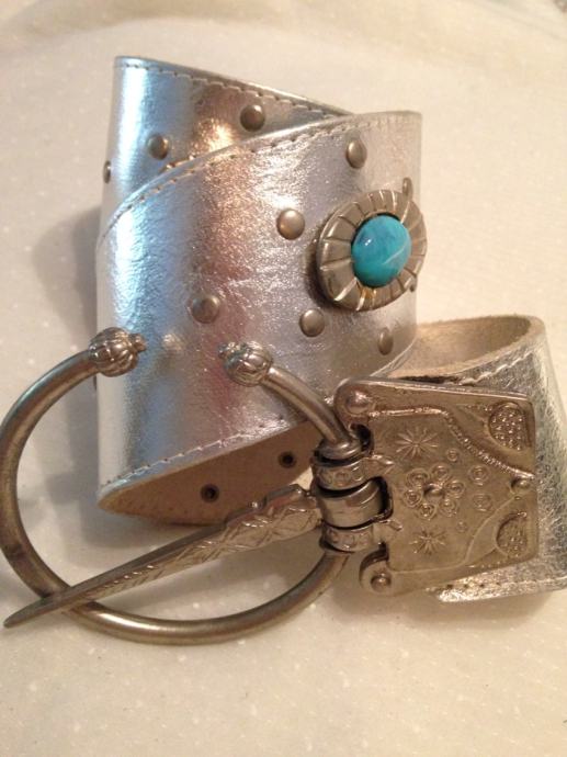 Oversize široki srebreni pojas od prave kože,unikatni sa metalnom etno ukrasnom kopčom i tirkiznim kamenom.Kroj remena pogodan za spušteni nošenje na bokove ,podiže odjevne kombinacije,haljine,tunike...vintage!