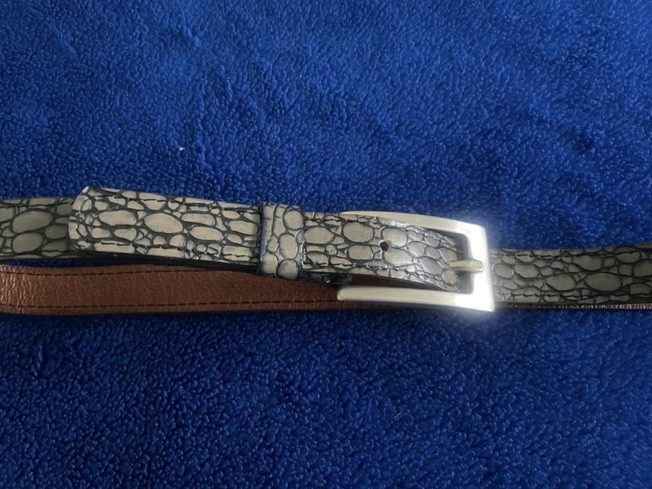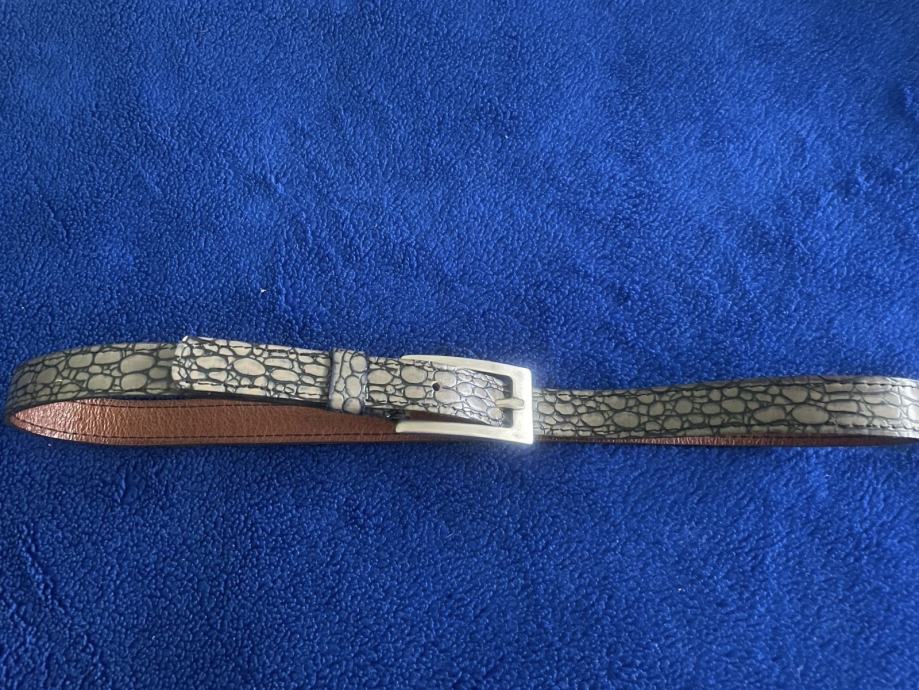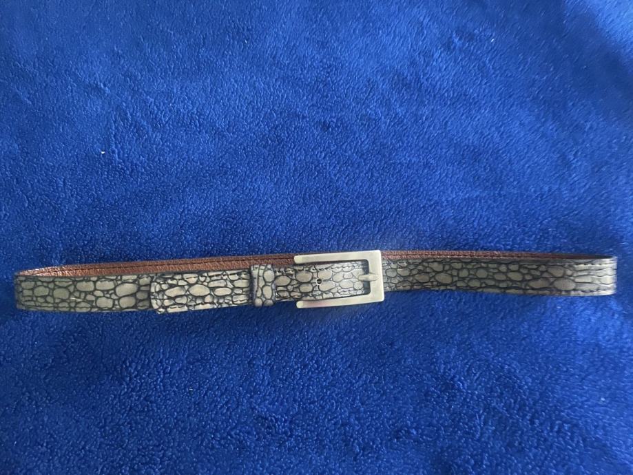 Zenski kozni remen, nov, nekoristen, sive boje sa printom pitona i podlogom sa unutarnje strane u smedjoj boji. Metalna kopca duzine 5cm. Remen do kopce duzine 79cm, a sirine 2cm.