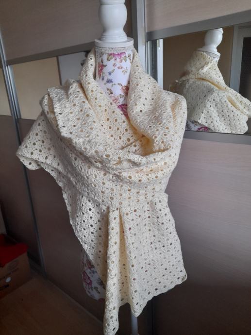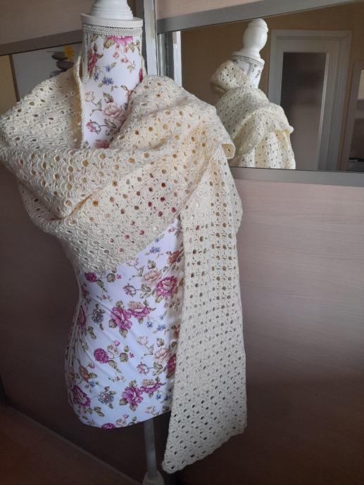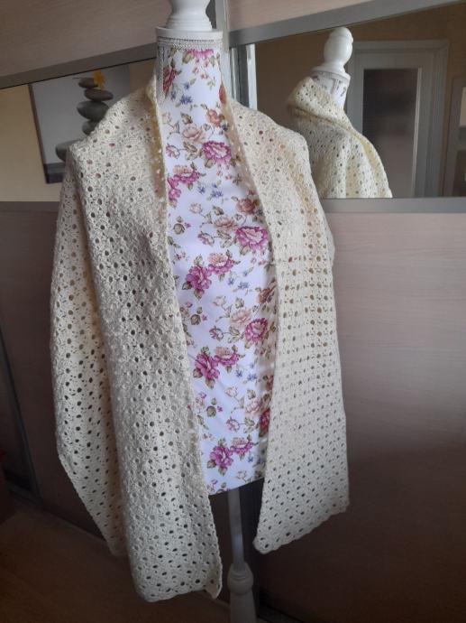 Prodajem novi heklani sal od tanke vune, dimenzije 190x41 cm. Boja svjetlo bez. Cijena 13 €. Inf na 035 260 202