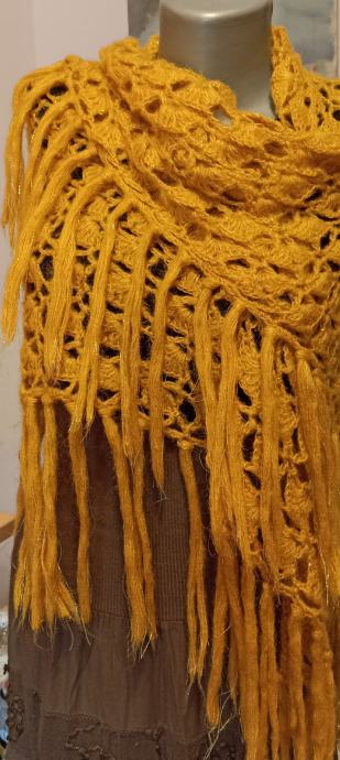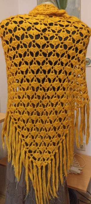 Trokut marama žuta vunica sa zlatnim nitima, lagana i topla ručno heklana, simbolična cijena.