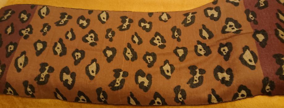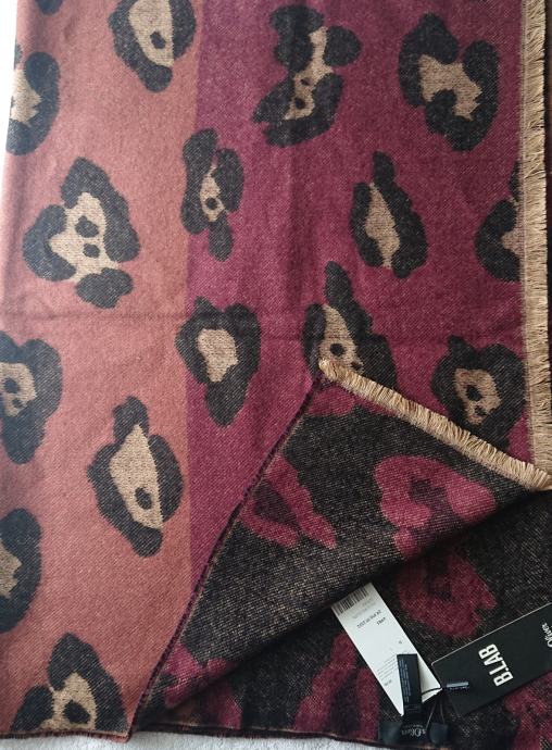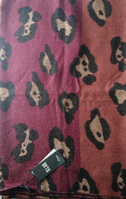 Šal marke s.Oliver, model iz linije B.LAB. Elegantan, a karakterizira ga upečatljiv leopard print na podlozi koja kombinira različite tonove boja-crvenu-bordo -smeđu-krem-crnu, te predstavlja bezvremenski dodatak svakoj garderobi. Šal je novi s etiketom.Cijena mu je bila 321.00 HRK, kupljen u S.Oliver dućanu.