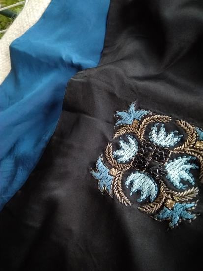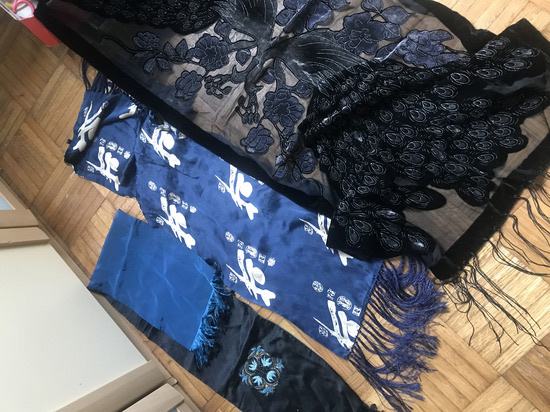 -Materijal prva dva uža šala je kao svila..tirkizno crni sa zlatnim koncem izvezen detalj … 10 eu, drugi tamno plavi sa japanskim slovima kao uzorak … PRODANOOOO