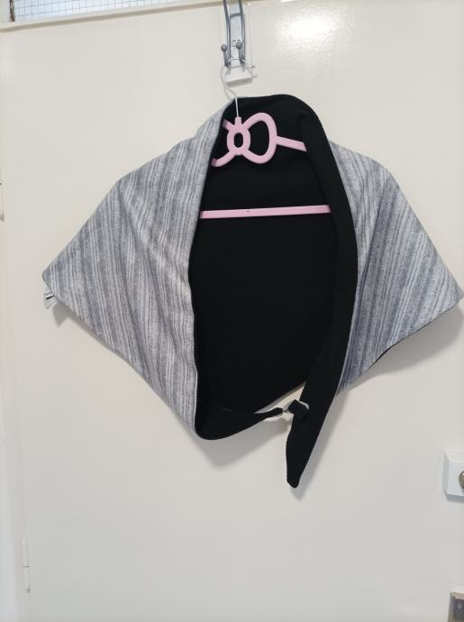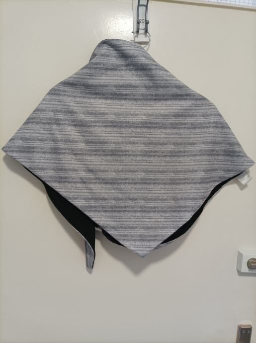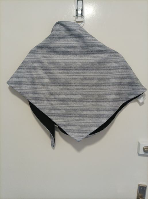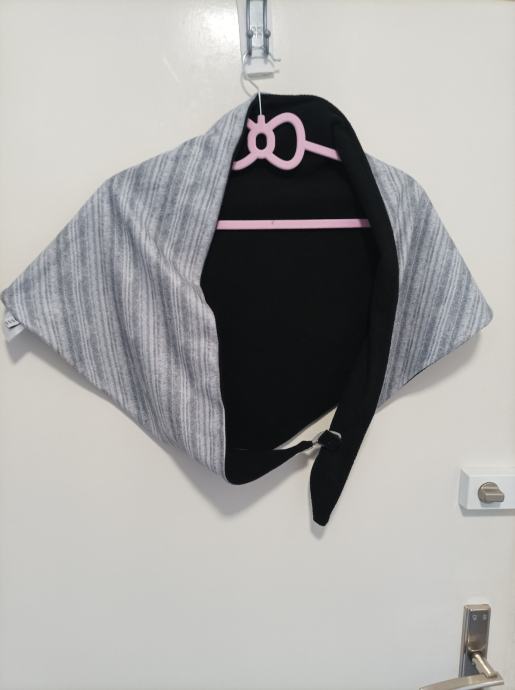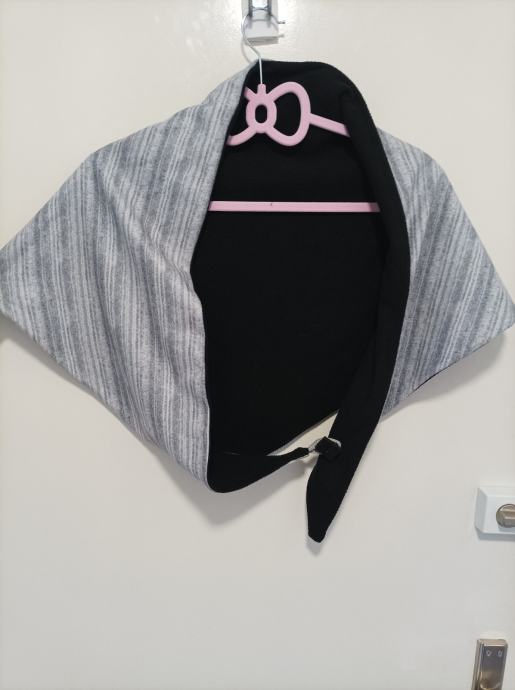 Prekrasan i neobičan sivo-crni šal oblika trokuta. ako se skine etiketa može se nositi na dvije strane. Kopča se zanimljivim gumbom. Može se nositi i na kaput, ali i na neku haljinu.