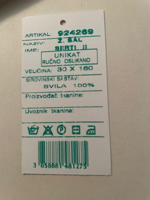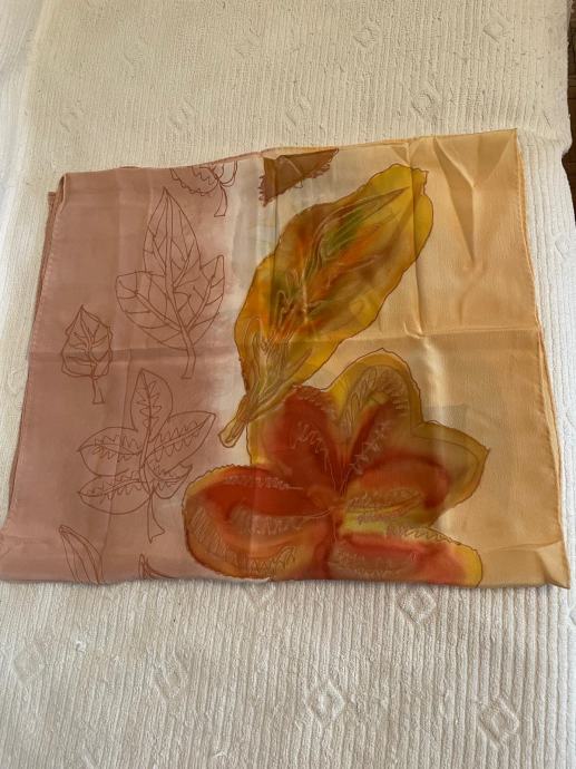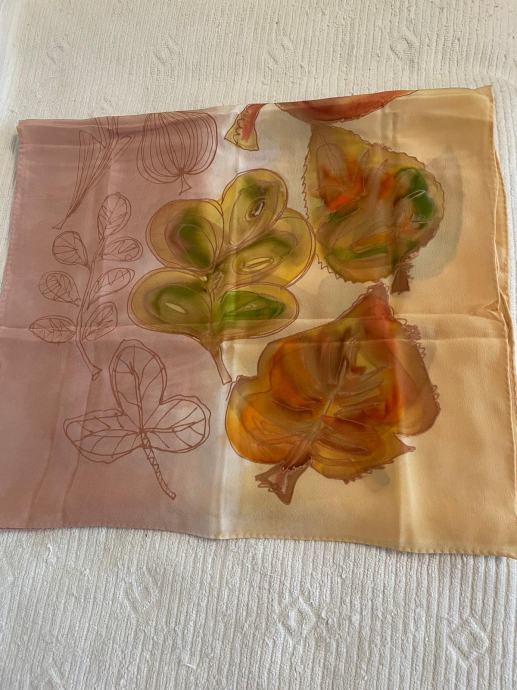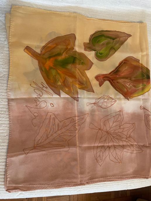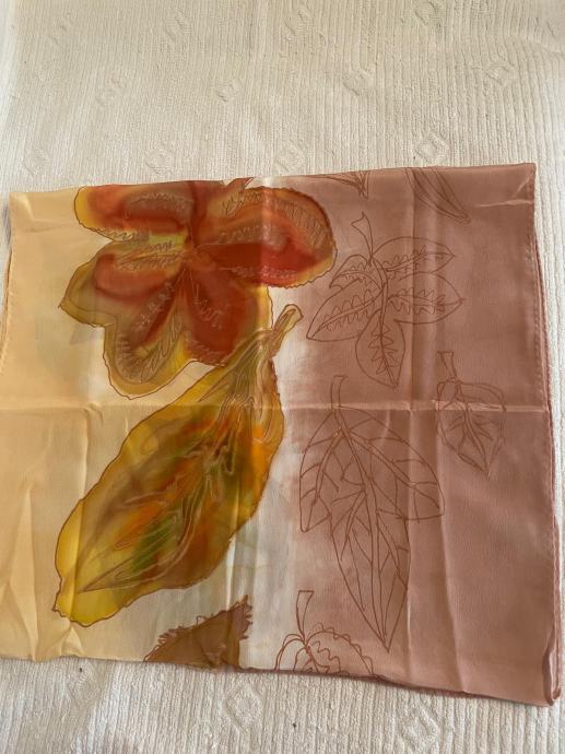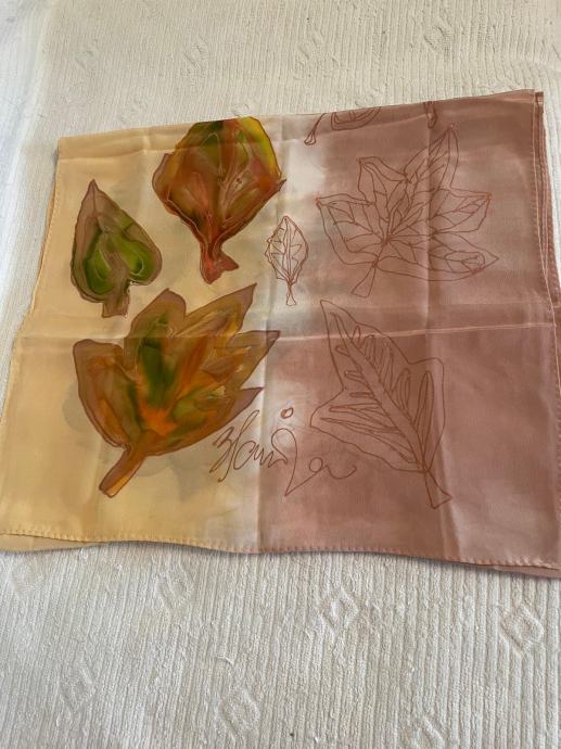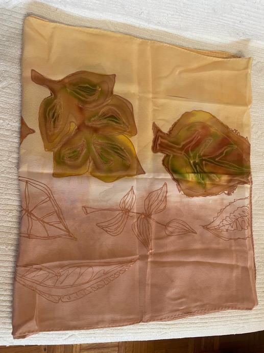 Zenski sal svileni (100% svila) rucno oslikano, motiv listovi u razlicitim bojama, dimenzije 30 x 180cm. Nekoristen, nov. Marke VIS K&G Varazdin.