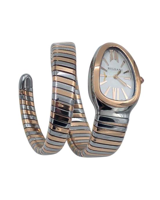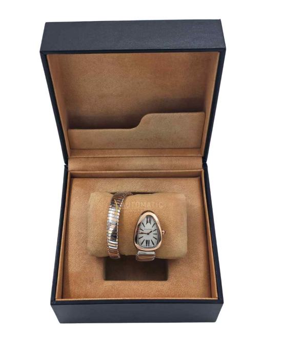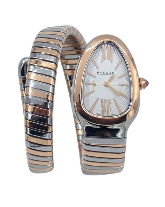 Bulgari Serpenti Tubogas ref. 103708 predstavlja jedan od najprepoznatljivijih i najikoničnijih ženskih satova u svetu luksuza. Spoj čelika i 18k roze zlata u nijansi 5N daje ovom modelu savršenu ravnotežu elegancije i modernog luksuza. Kućište dimenzije 35 mm oblikovano je u prepoznatljivi Serpenti siluetu, dok beli brojčanik sa zlatnim indeksima dodatno naglašava sofisticiran dizajn.