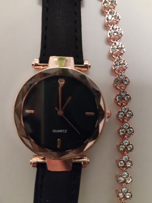Prodajem novi, elegantan, crni sat sa zlatnim rubom i zlatnom narukvicom, kao na slikama.