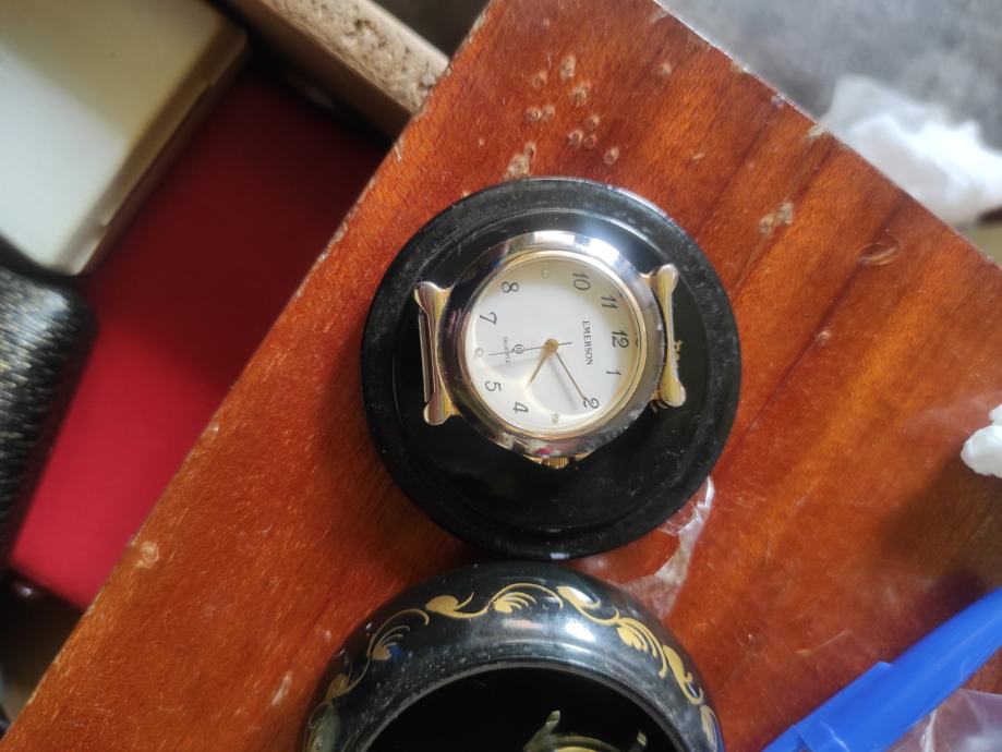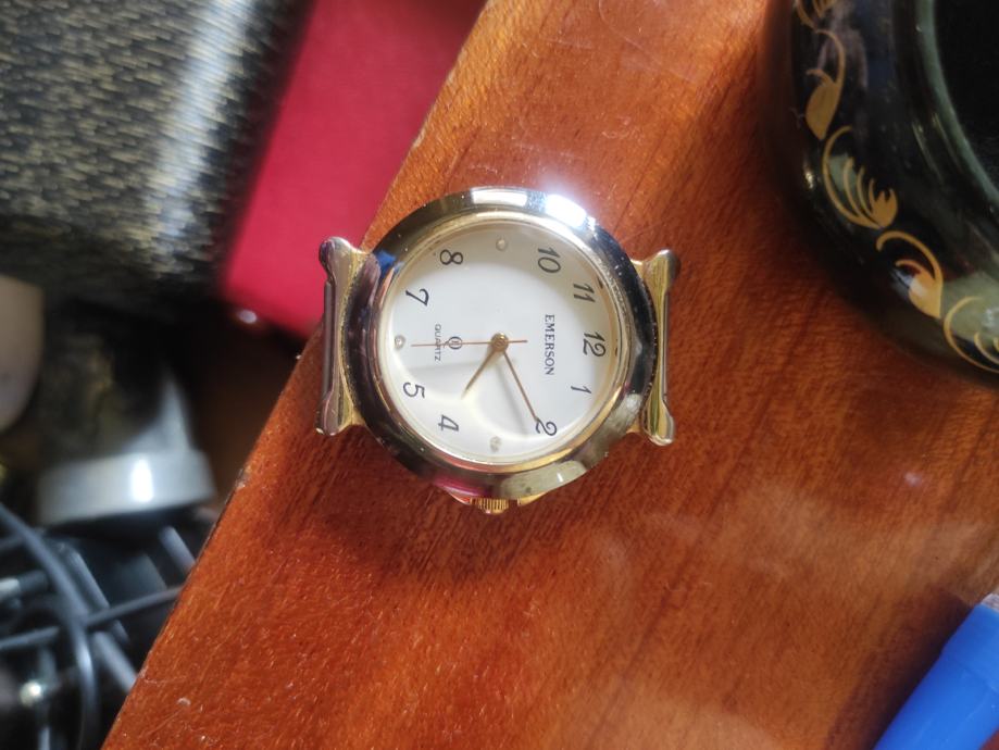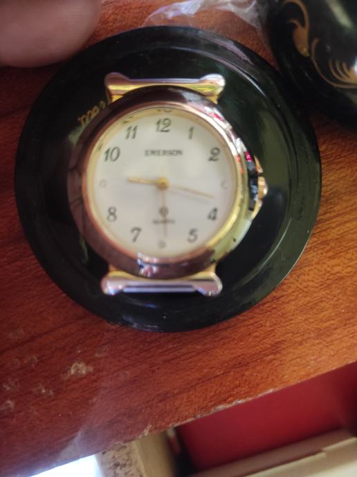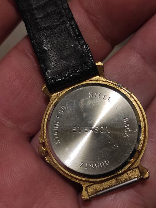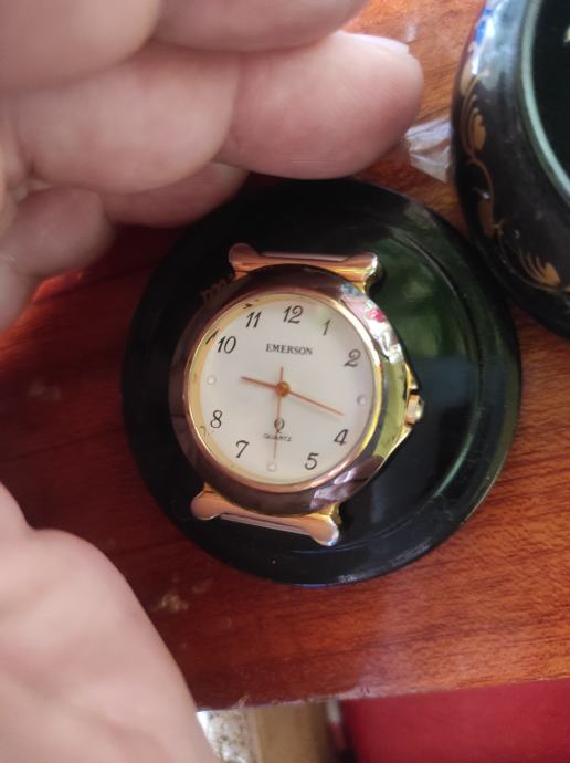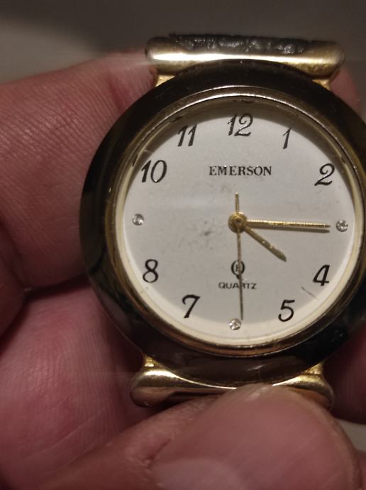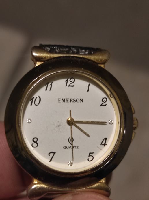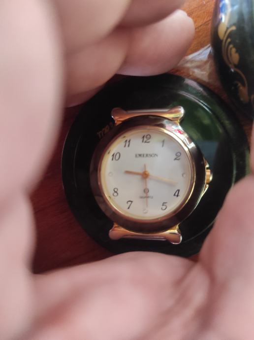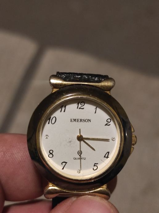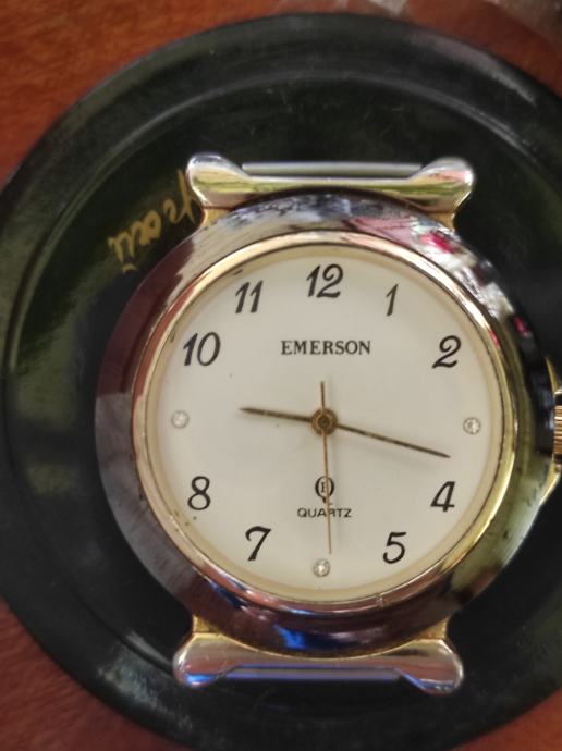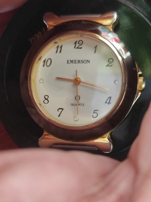 Ženski sat Emerson sa tri draga kamena koji označavaju 3,6 i 9 sati.Sat je potpuno ispravan.Mozete me dobiti na Viber ili Njuskalo, ili nazovite na broj 097-660-1365, za sve informacije o satu.Šaljem Poštom ili Tiskom ili u dogovoru sa kupcem.Kuciste zlatne boje sa rubom od kamena plavkaste boje koja se preslikava u ljubičasto- roza boju ovisno o kutu gledanja,a kucište iza je od nehrđajućeg čelika (Stainlles Steel.).SAT je dosta star,bio od bake,ali je ocuvan , izgleda kao da je sada izisao iz trgovine,bateriju cu promjeniti o svoj trosak,a remen je crni kozni ali nije bas naj bolji tako da si kupac treba uzeti novi remen, a ovaj stari Šaljem sa satom kupcu.Vidi slike!!