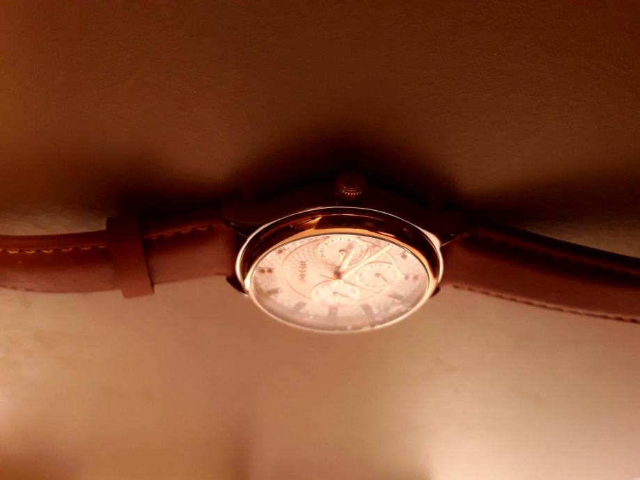 Sat ima mineralno staklo i kožni remen. Uz normalne kazaljke ima i dodatne kazaljke za dane, sate i datum.