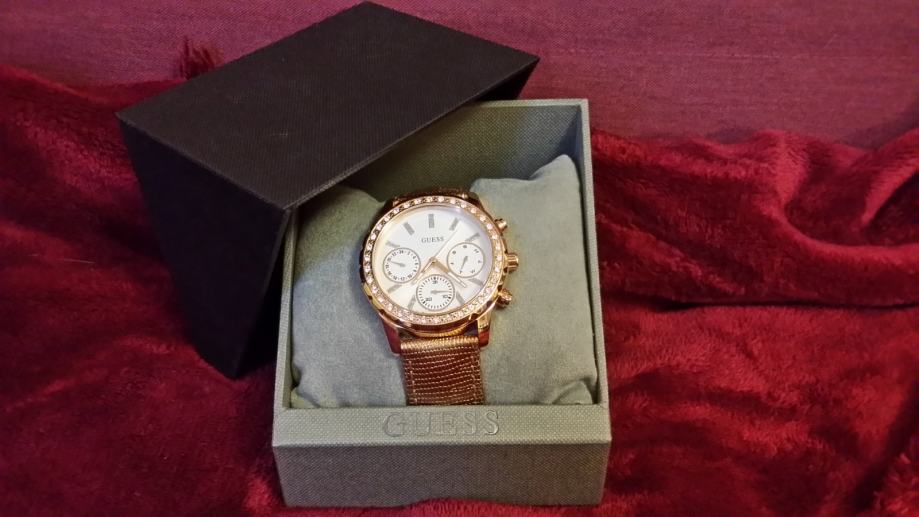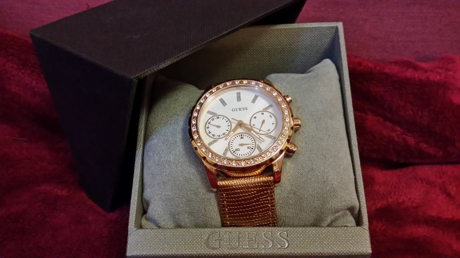 Novi ženski sat Guess, sa kutijom i garancijom 11.5 mjeseci. Kupljen u Watch centru za 1.300 kn. Kožni remen, Swarovski kristali, prekrasan. Savršeni poklon :)