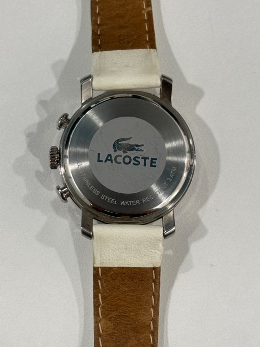 Prodajem ženski Lacoste sat s elegantnim srebrnim brojčanikom i funkcijom kronografa.