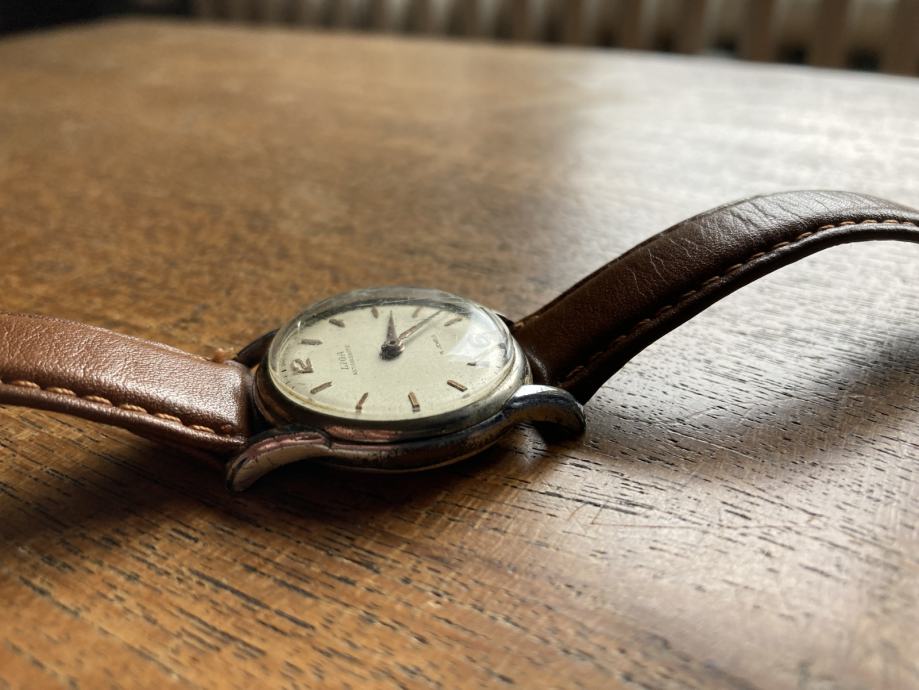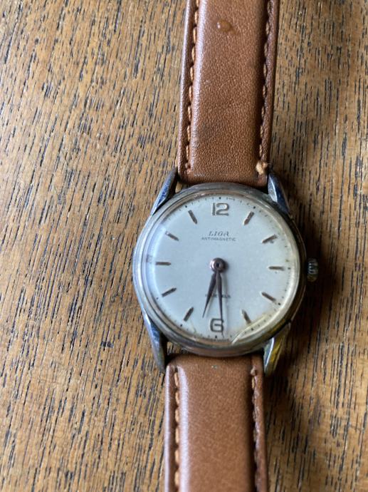 Liga Swiss made ženski sat, mehanički, na navijanje, kožna narukvica, dobro očuvan, ima nekoliko manjih ogrebotina na staklu. Sat je potpuno ispravan, radi. Promjer 28 cm.