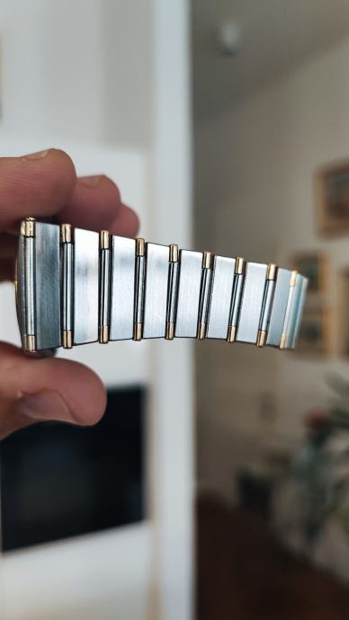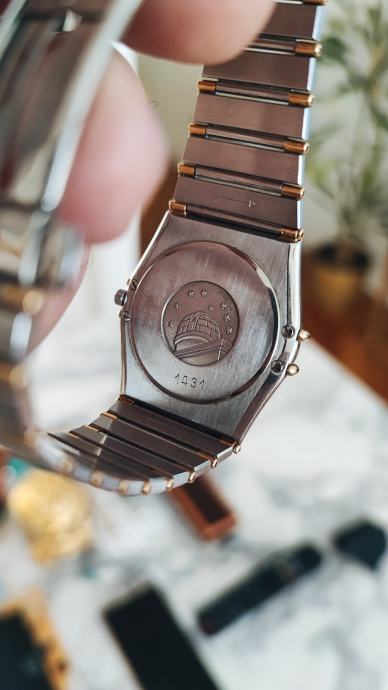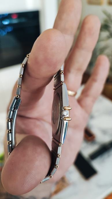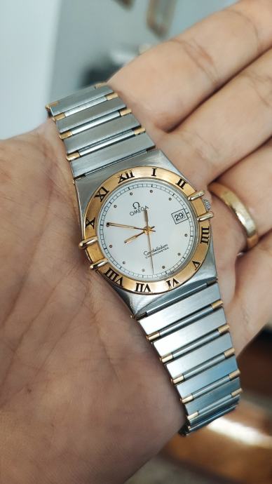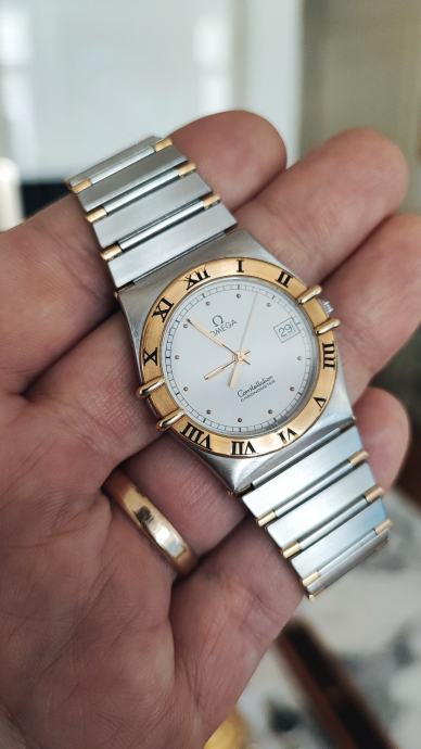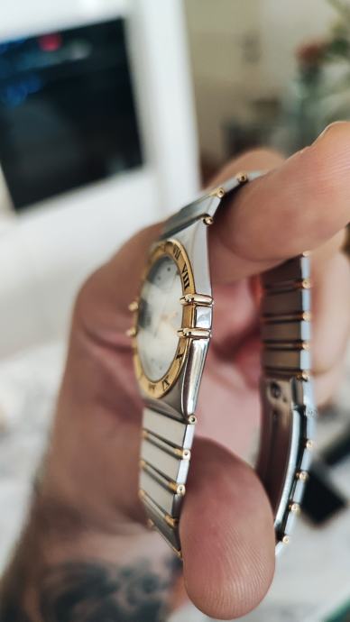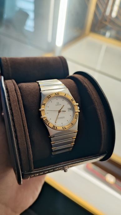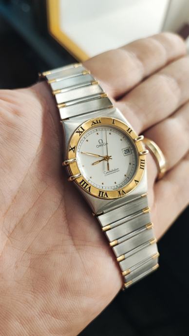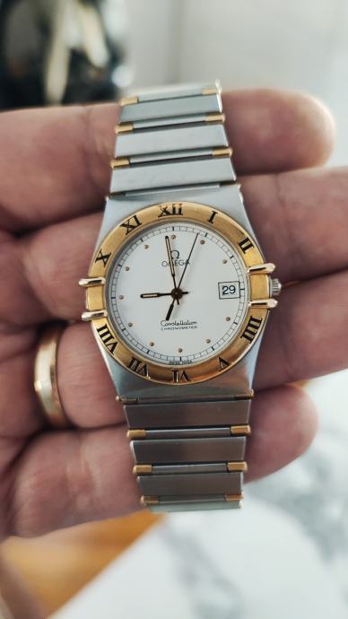 Na prodaju prelijepa ženska/unisex Omega Constellation Chronometer two tone (čelik i pravo 18k zlato, ne pozlata) iz 90tih godina u jumbo veličini 33.5mm s integriranom narukvicom za zglob do 17-17.5cm. Sat je u savršenom radnom stanju, Omega Chronometer iznimno precizni quartz mehanizam radi bezprijekorno, baterija je svježe zamijenjena. Estetski je sat također u odličnom stanju, s normalnim tragovima nošenja na narukvici dok su safirno staklo, brojčanik, kazaljke i kućište fantastično očuvani. Sat dolazi sa putnim etuiem i kvalitetnom kožnom kutijom.