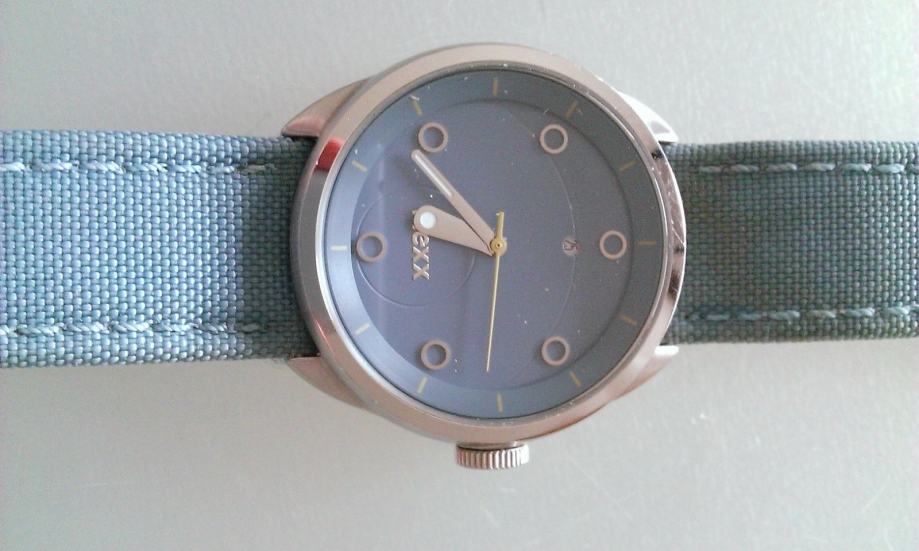 Plavi MEXX sat s remenom od koze prevucene platnom.