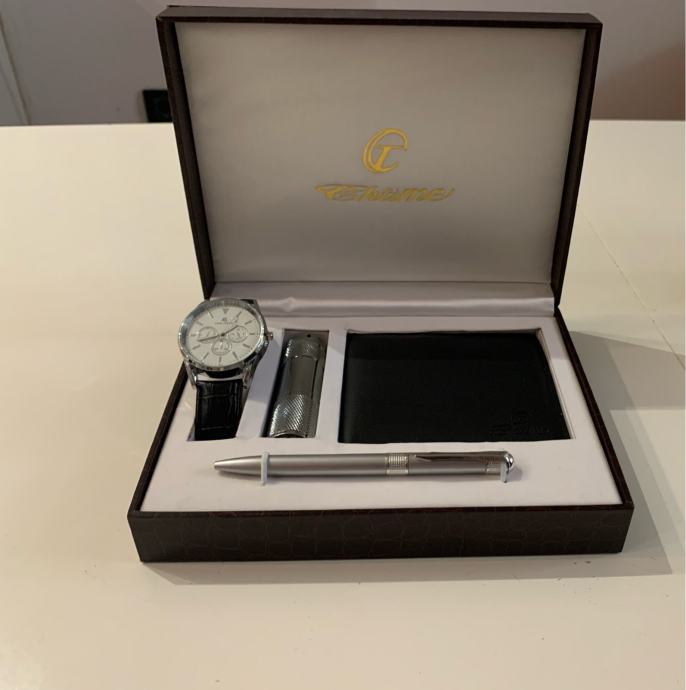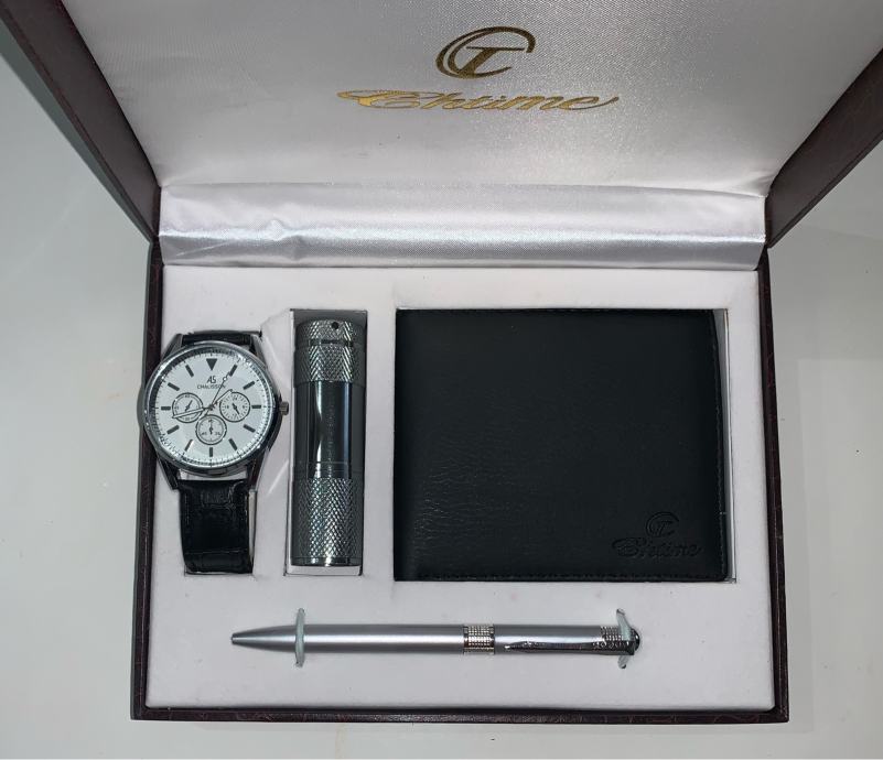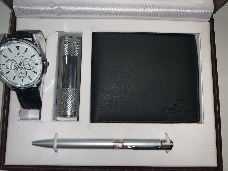 U setu se nalazi ručni sat,kemiska olovka,svjetiljka te novčanik.
