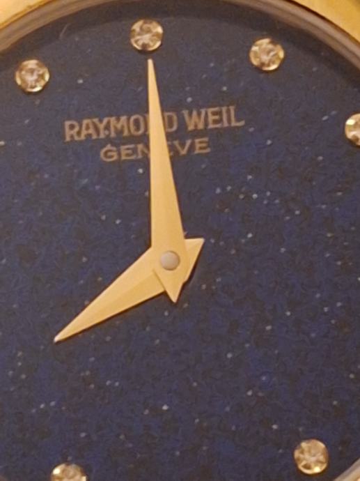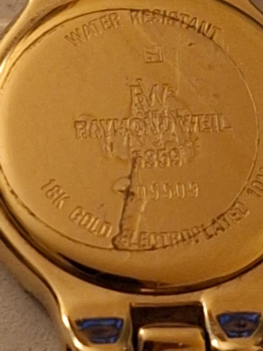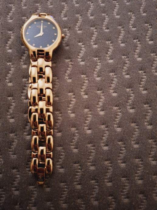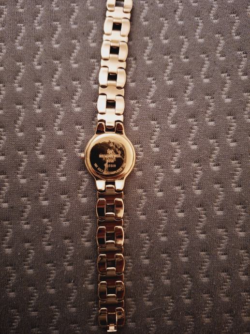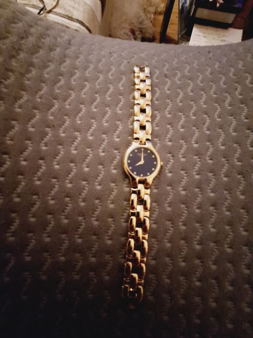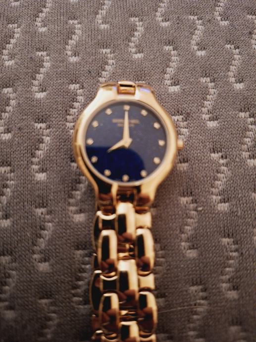 Zlatni sat, 18 k zlato, tamno plava pozadina sa zlatnim brojcanikom cirkonima i zlatnim kazaljkama.