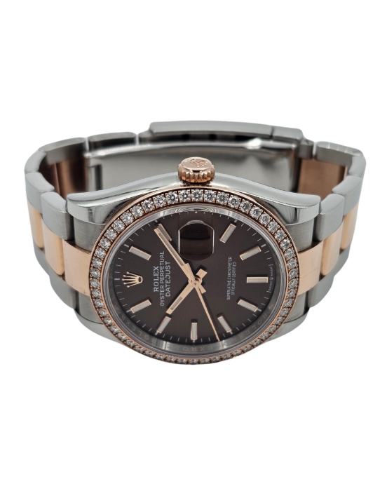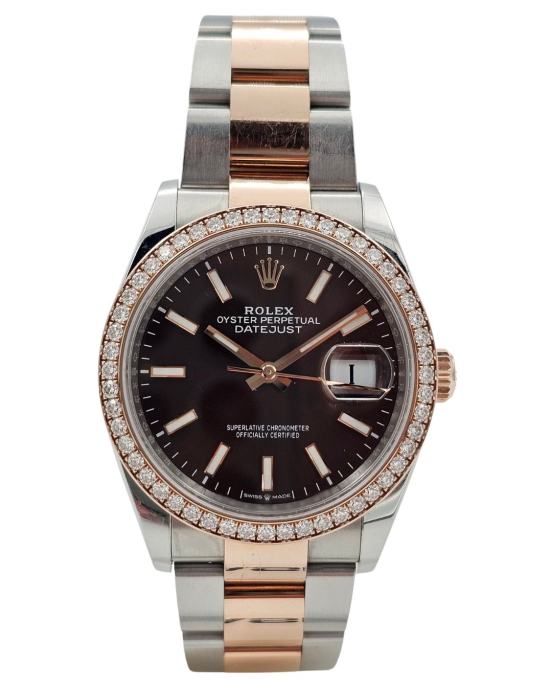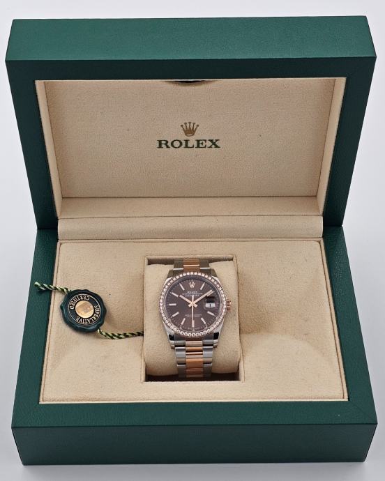 Rolex Datejust 36 je luksuzni i elegantni model koji kombinuje nerđajući čelik i Rolex-ovo ekskluzivno Everose zlato. Njegov sofisticirani crni brojčanik sa dijamantskim markerima, zajedno sa prelepim dijamantskim bezelom, daje ovom satu bezvremensku eleganciju. Opremljen je Calibre 3235 mehanizmom sa 70 sati rezerve snage, garantujući vrhunsku preciznost i pouzdanost. Ovaj model je idealan za one koji žele kombinaciju luksuza i funkcionalnosti u svakodnevnom nošenju.