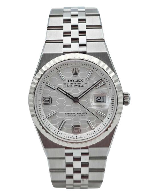 Rolex Land-Dweller referenca 127234 iz 2025. godine predstavlja novu interpretaciju luksuznog sata namenjenog modernom, aktivnom načinu života. Kućište je izrađeno od Oystersteel čelika, dok je bezel od 18k belog zlata, što satu daje prepoznatljivu eleganciju i izuzetnu otpornost na svakodnevno nošenje.