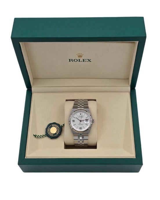 Prečnik kućišta pruža savršen balans između sofisticiranog izgleda i praktičnosti, dok čitljiv brojčanik sa jasno definisanim indeksima i Rolex Chromalight luminescencijom omogućava lako očitavanje vremena u svim uslovima. Safirno staklo sa povećalom iznad datuma dodatno naglašava funkcionalnost i prepoznatljiv Rolex dizajn.