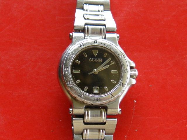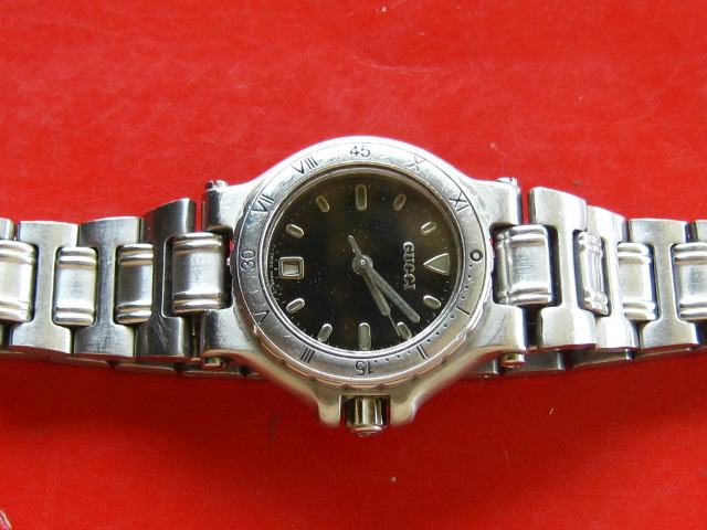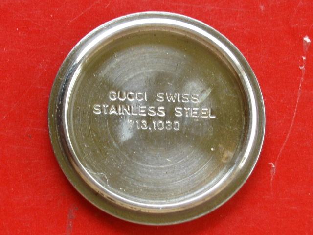 POVOLJNO..Original ženski Swiss "GUCCI"...mehanizam pozlaćena ETA 955.112 V8 Swiss made-7 jewels...full čelično kućište promjera 27,5 mm bez krunice i lugova...originalna potpisana krunica...originalna čelična potpisana narukvica...WR 100 metara...poklopac na navoj...