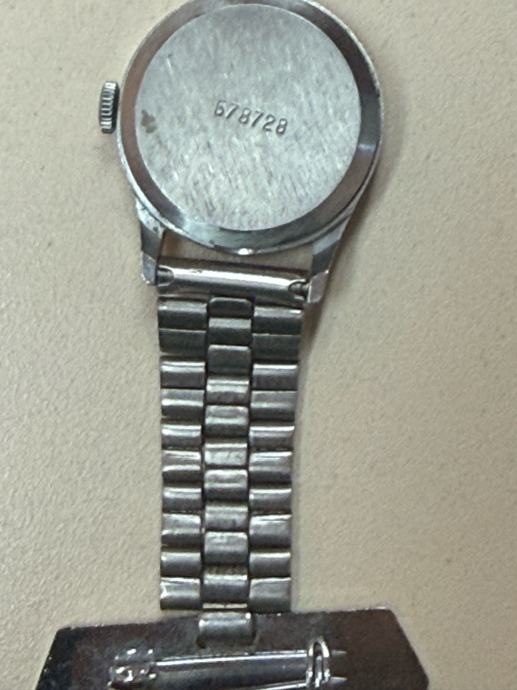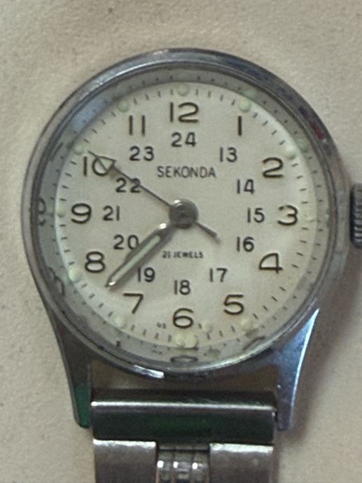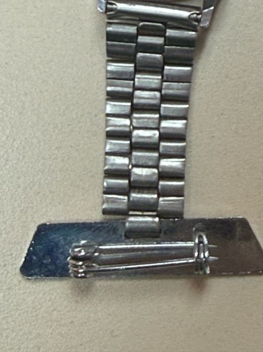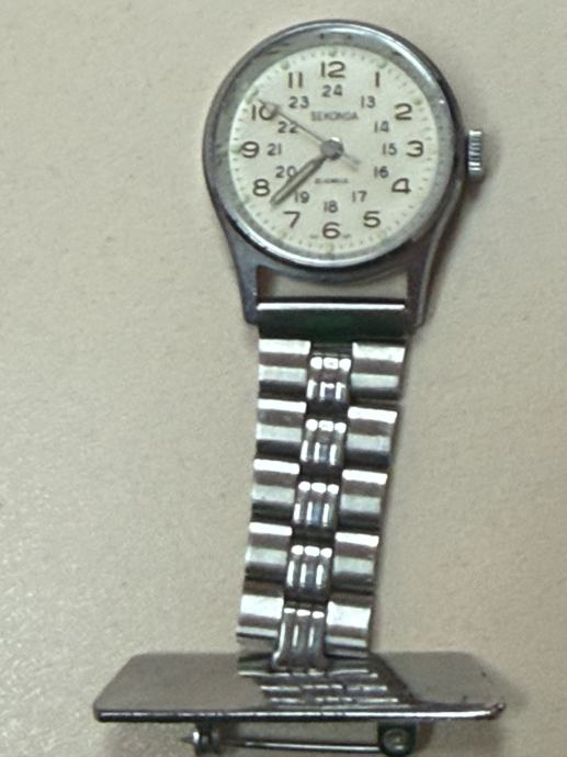 Prodajem sat za rever na kopčanje, marke Sekonda. Radi se o klasičnom modelu s bijelim brojčanikom na kojem su prikazana i 12-satna i 24-satna podjela vremena. Mehanizam ima 21 jewels. Kućište i narukvica su srebrne boje, izrađeni od metala.