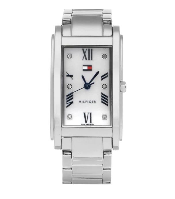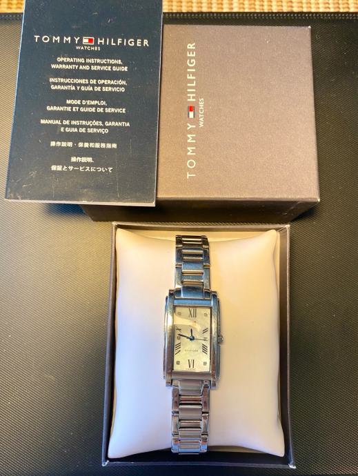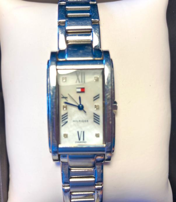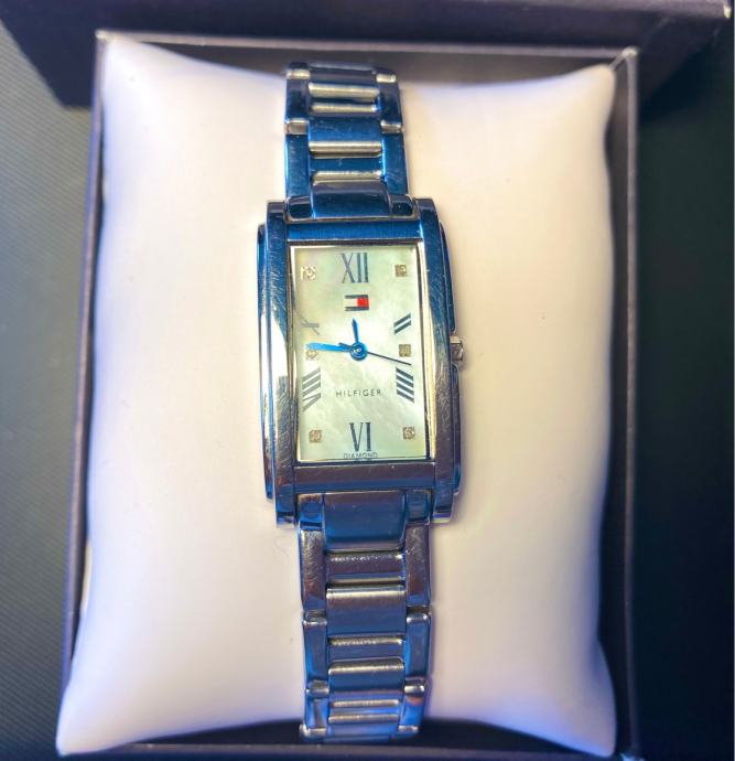 Ženski sat HILFIGER DIAMOND sa sedefnim brojčanikom i šest kamenčića. U komplektu original kutija i knjižica. U vrlo dobrom stanju, ima sitne tragove nošenja.