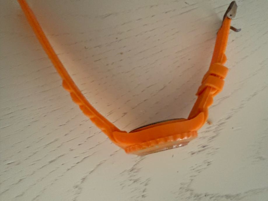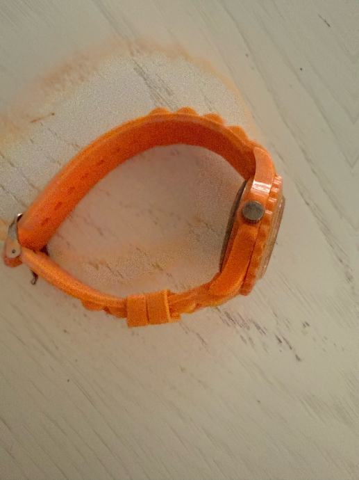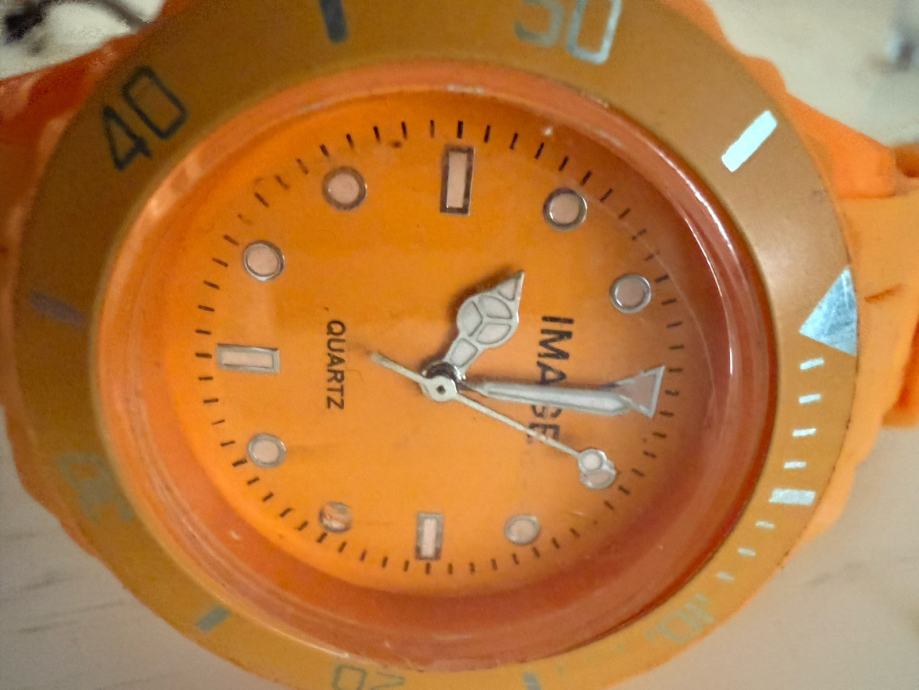 Prodajem ženski kvarcni sat narančaste boje s gumenom narukvicom. Sat ima okrugli kućište s rotacijskim lunelom i narančastim brojčanikom. Radi se o modelu quartz mehanizma, a na brojčaniku je vidljiv natpis "IMAGE". Narančasta boja čini ga prepoznatljivim i upečatljivim dodatkom.