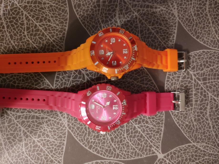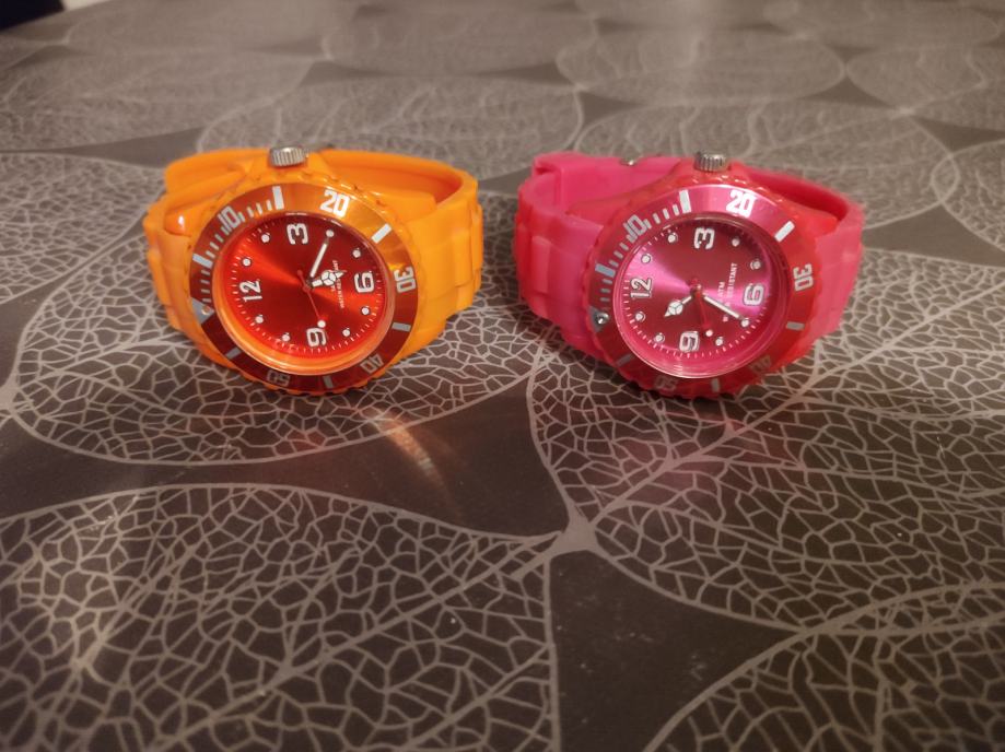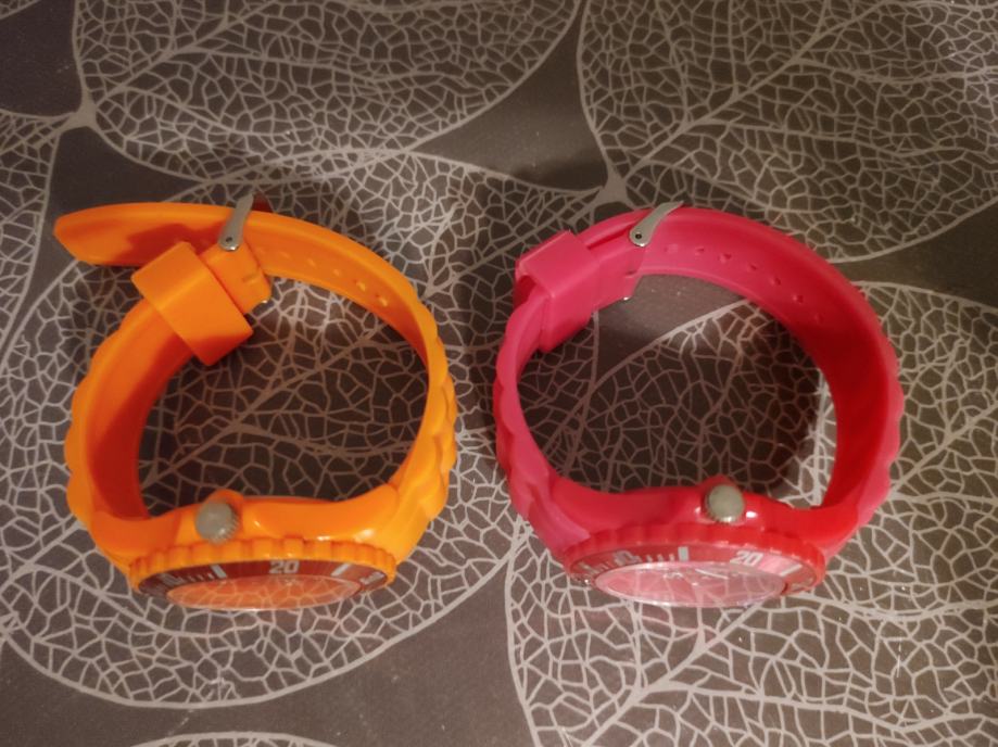 Sat silikonski/ gumeni, boja ciklama ili narančasti. Skala s minutama se okreće. 3€/kom. 5€/par