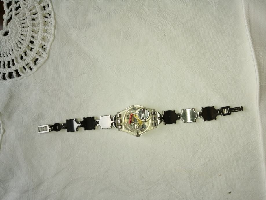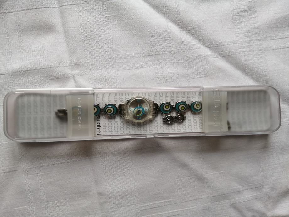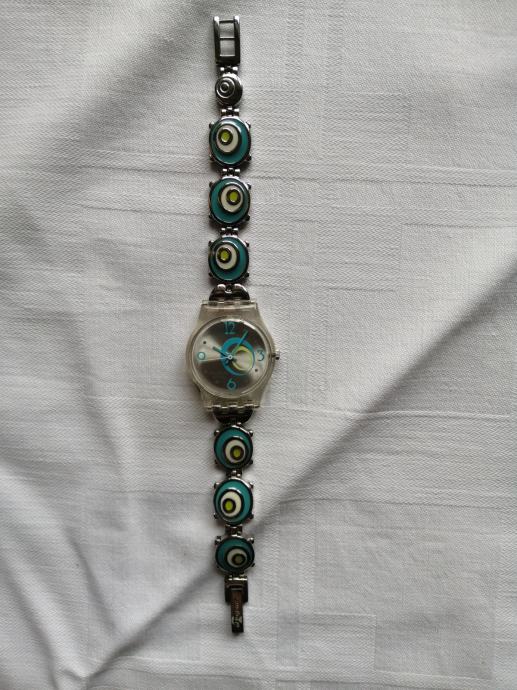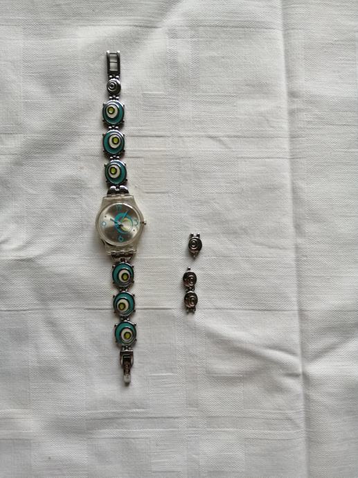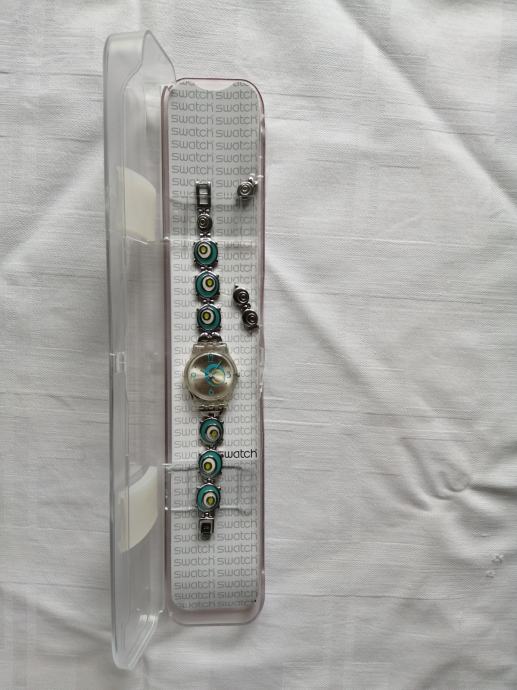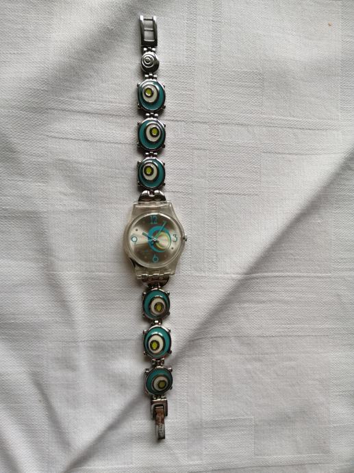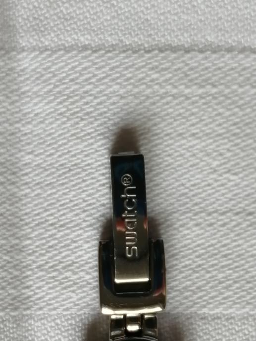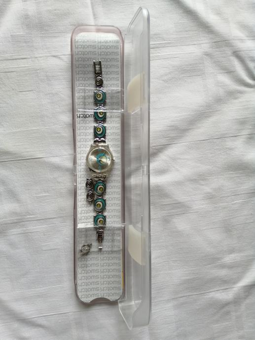 Prodajem potpuno novi i nekorišteni švicarski ženski sat Swatch marke, sat od kvarca i narukvicom od nehrđajućeg čelika, švicarske izrade, srebrn sa tirkizno-zelenim očima na remenu, izrađen po švicarskoj kvaliteti, nikad nošen, vodootporan. Dobiven prije nekoliko godina no nikad nošen ni izvađen iz kutije. Nova baterija stavljena 11.09.2019. U originalnoj Swatch kutiji sa priloženim uputstvima. Duljina sata s narukvicom: 170 mm, narukvica ima tri odvojena okrugla dijela za proširiti dužinu sata za 35 milimetara da pristaje širini zgloba.
