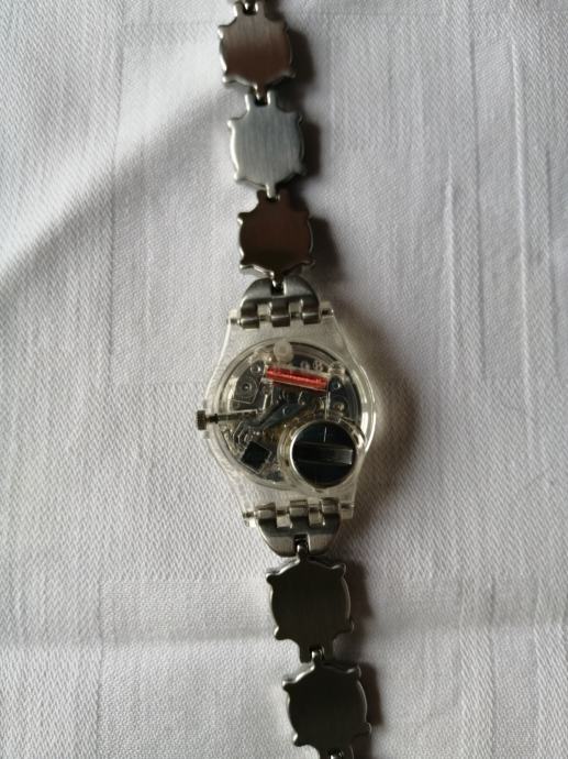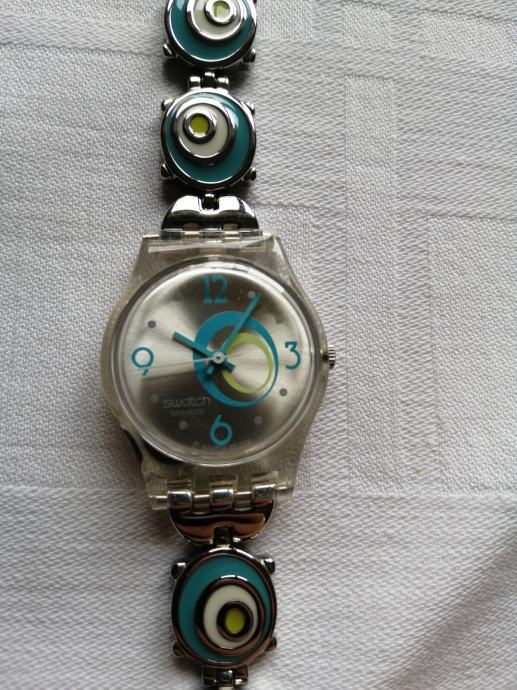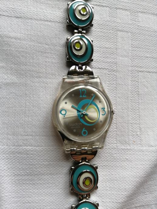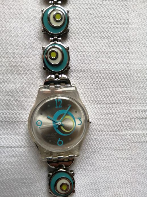 Ovaj sat iz Swatch kolekcije sadrži srebrni brojčanik s tri ruke i tirkizni indeks te logotip "Swatch" u centru brojčanika.