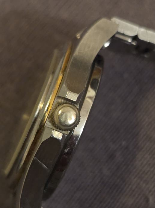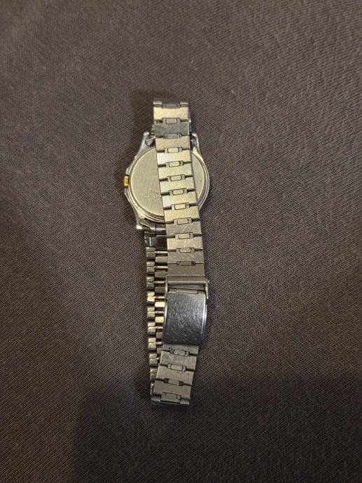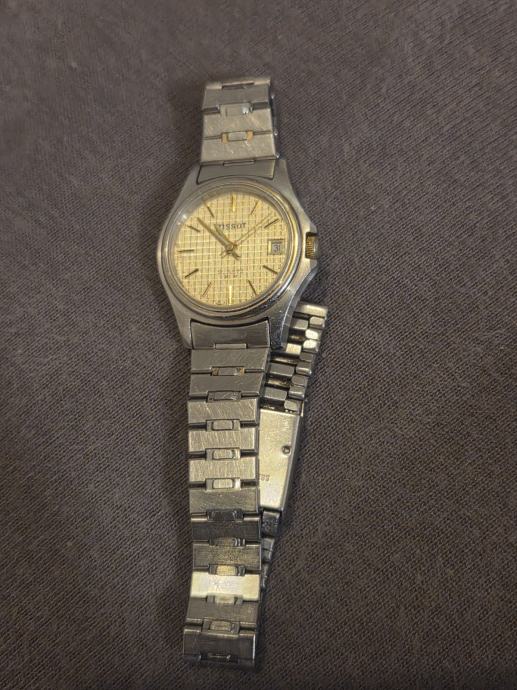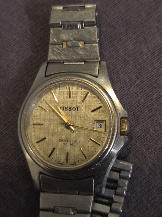 Prodajem rabljeni Tissot quartz ženski sat s metalnom narukvicom (narukvica nije original) i zlatno-srebrnim dizajnom. Sat ima klasičnu elegantnu teksturiranu zlatnu brojčanicu s indikatorom datuma i kvalitetno izdrađen kućište od nehrđajućeg čelika. Ovo je original Tissot model, ima na sebi tragove korištenja.