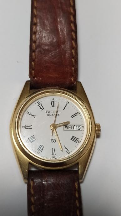 Seiko ženski ručni sat, original Seiko, kožni remen, očuvan, u ispravnom stanju, potrebna zamjena baterije, quartz, 081319, base metal st. steel back, water resistant, dužina kućišta 2,7 cm, širina 2,3 cm, promjer samog sata bez okvira 1,7 cm, dužina s remenom 20 cm.