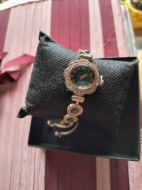 Predivan ručni ženski sat sa podesivim remenom u zlatnoj boji sa zelenim kamenčićima i cirkonima.