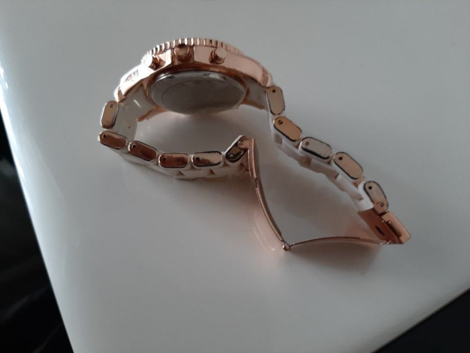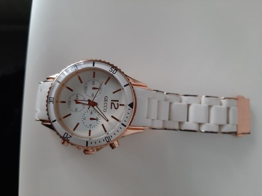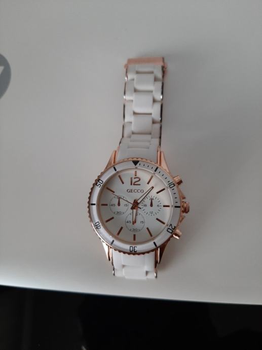 Ženski sat ..marke GECCO...bjelo zlatna kombinacija..zbog stajanja i nekorištenja..ide u prodaju..potrebno promjeniti bateriju..stanje novo..sve vidljivo na slikama..