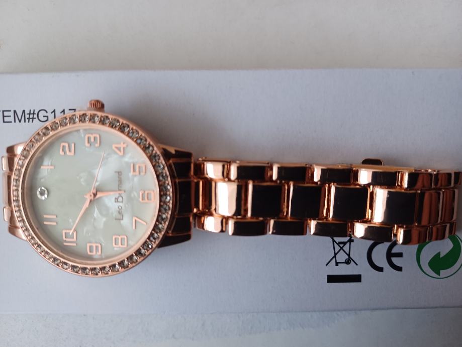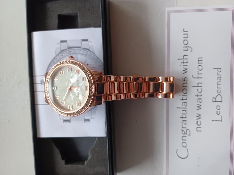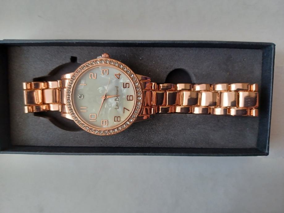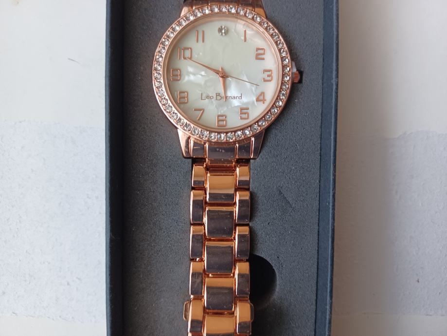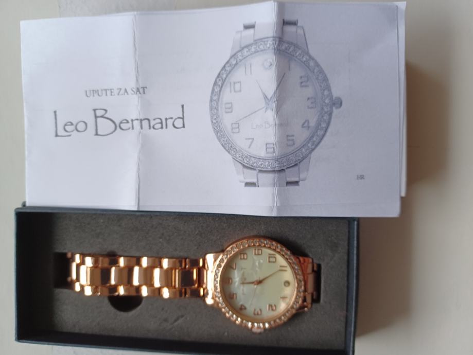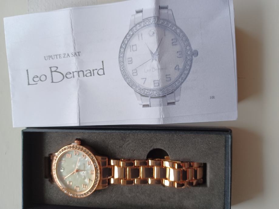 Sat Leo Bernard sa dijamantom na br.12, obrubljen sa 46 kristala. Ima dugmastu bateriju 377. Narukvica je izrađena od nehrđajućeg čelika.