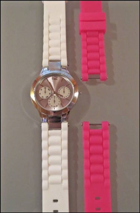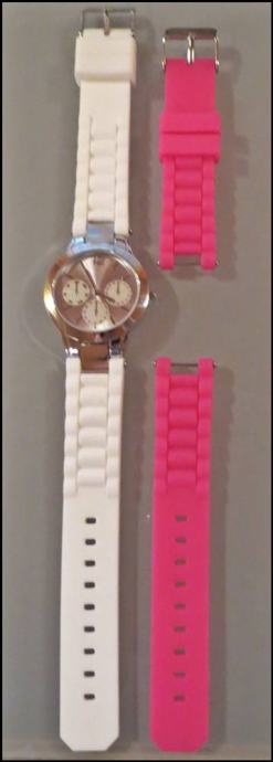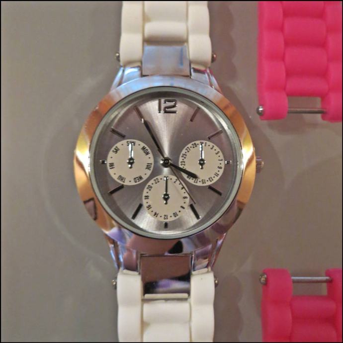 Prodajem nov, nenošen ženski sat. Silikonska narukvica, nova baterija. Roza i bijela narukvica. Dobiven na poklon