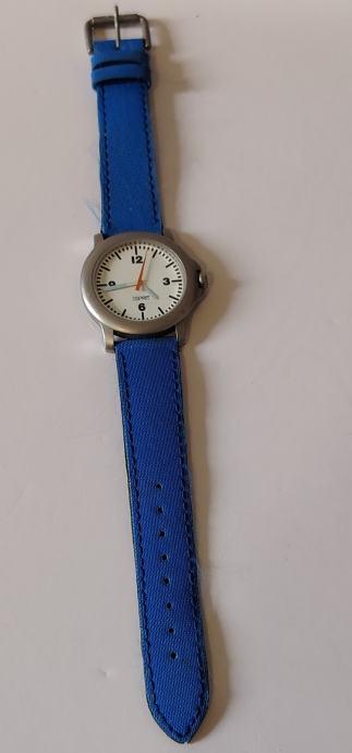 Sat ima bijeli brojčanik s lako čitljivim crnim arapskim brojevima i upečatljivom crvenom sekundarkom. Kućište je metalno/srebrne boje, a remen je od plavog tekstila. Malo korišten