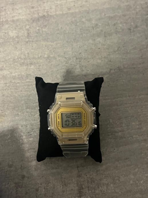 Novi nikad koristeni sat modernog dizajna u zlatnoj boji s prozirnom narukvicom sat ima razne funkcije kao sto su alarm stoperica datum dan u tjednu led svijetlo za gledanje po mraku... Sat je kvalitetan,precizan i nov.