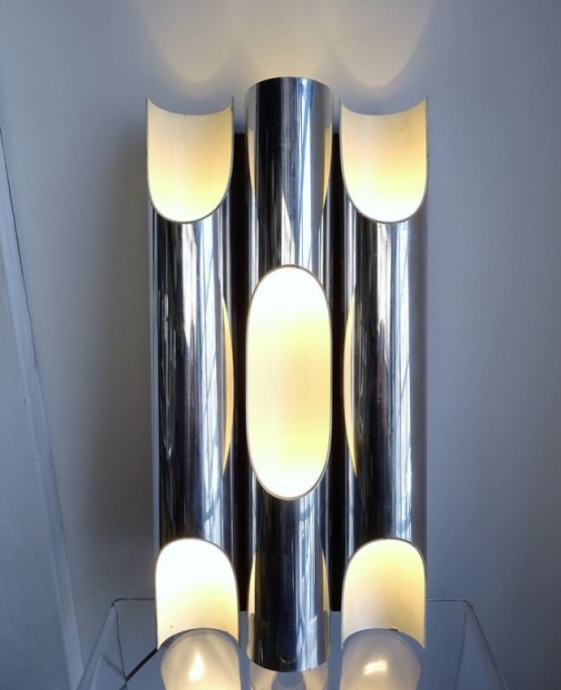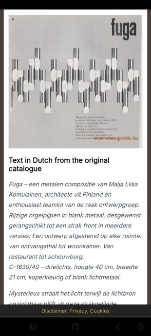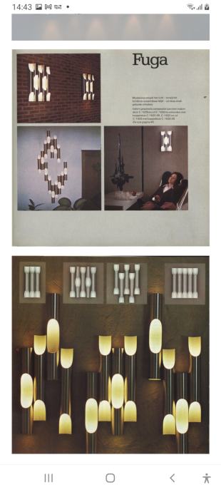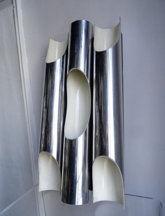 Ove zidne lampe dizajnirala je oko 1968 -1970. finska arhitektica/industrijska dizajnerica Maija Liisa Komulainen: kraljica Raakovog dizajnerskog tima. Komulainen je osvojila nekoliko međunarodnih nagrada. Njezini dizajni igraju se (ne)fleksibilnošću metala i svjetlosti. Visoke orguljske cijevi od aluminijum metala mogu se rasporediti u elegantnu prednju stranu u više verzija, dok izvor svjetlosti ostaje nevidljiv. Pružaju atmosfersku rasvjetu.