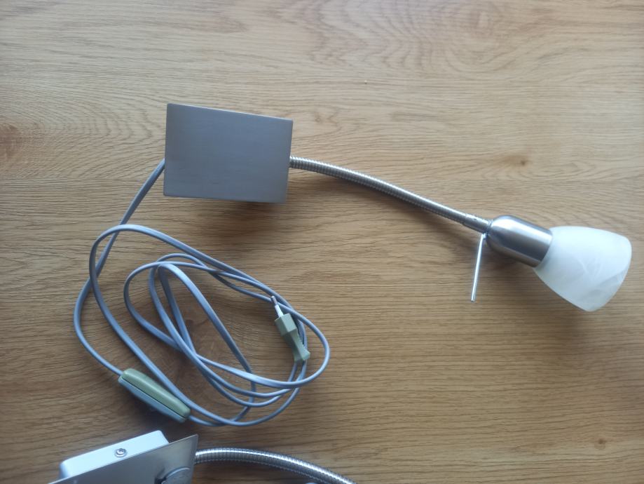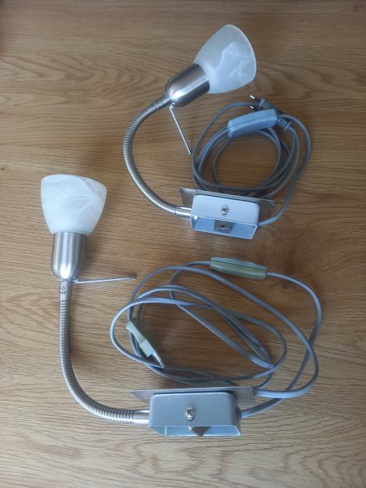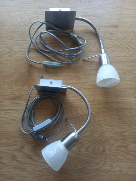 Prodajem dvije potpuno iste noćne lampe za bračni krevet i sl. Lampe su potpuno ispravne i bez oštečenja, vrlo kratko korištene inox metal, u lampe idu žarulje grlo E14 , Montiraju se lako na zid, knauf ili drvo, okreću se u svim smjerovima, cjena za obje lampe u kompletu je 20 e.
