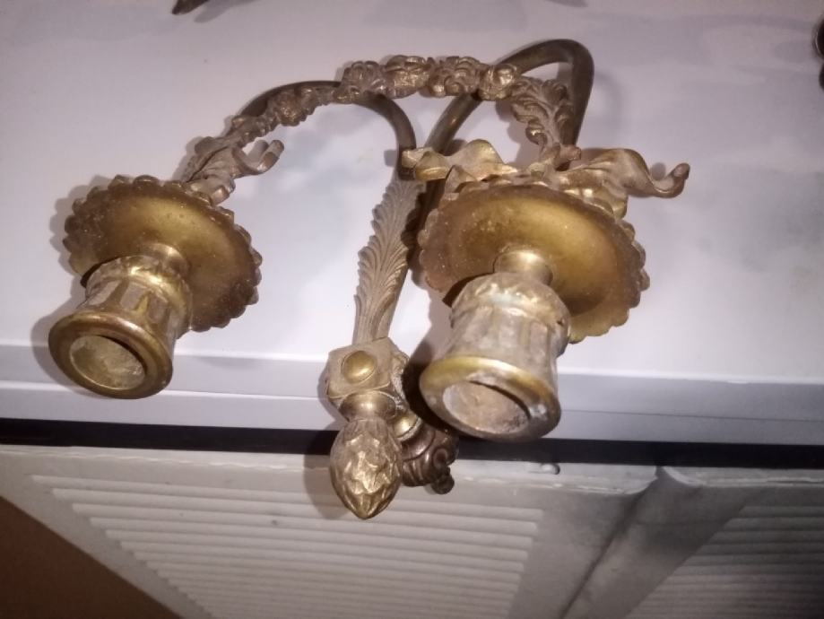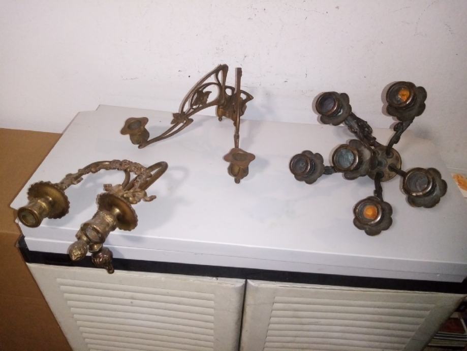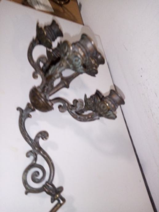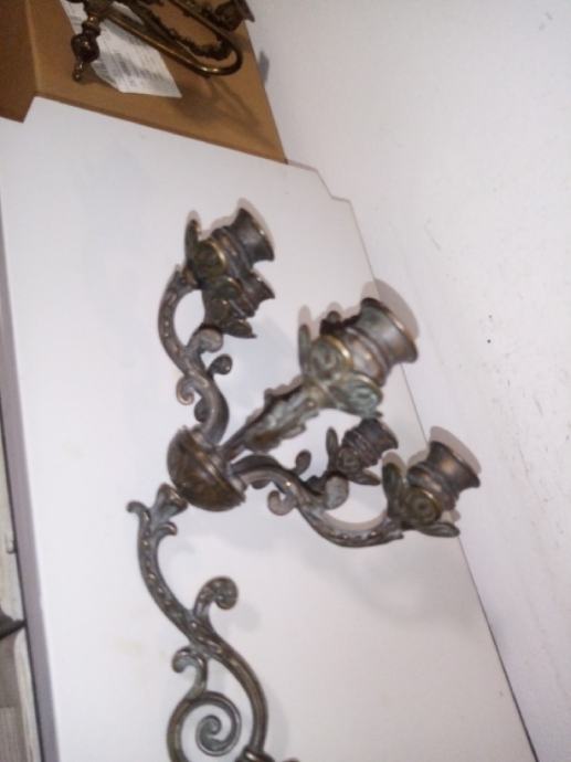 Druga slika starinski mesingani zidni svijećnjak sa 2 kraka 30 eura, treća slika starinski mesingani svijećnjak sa 2 kraka 25 eura, četvrta slika starinski mesingani svijećnjak sa 6 krakova 40 eura