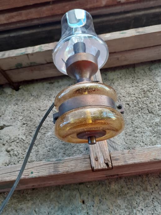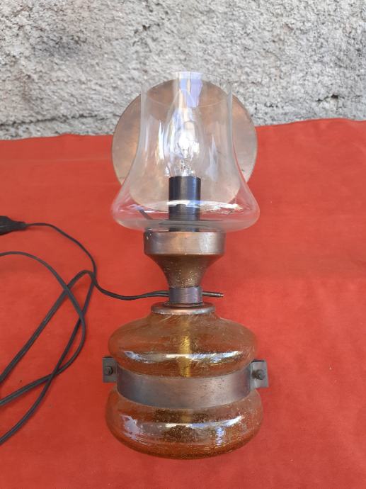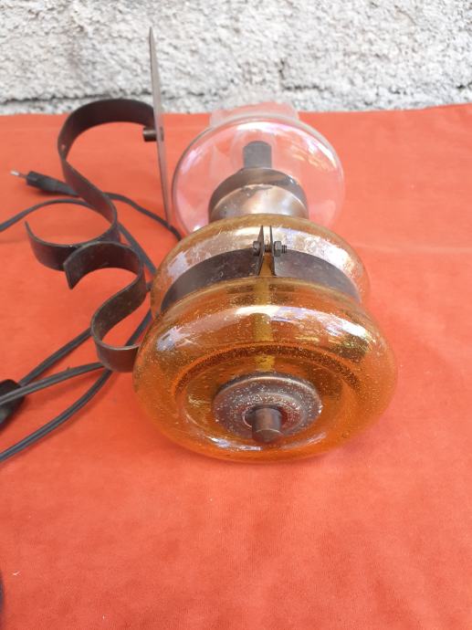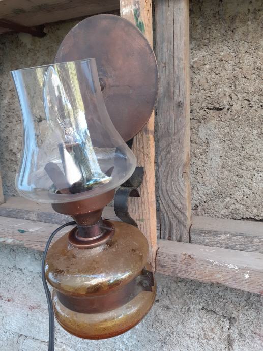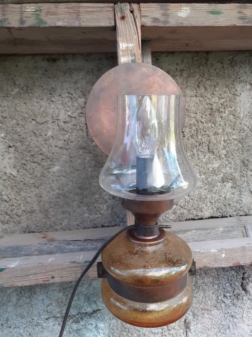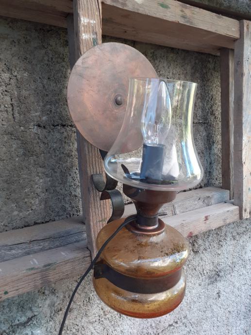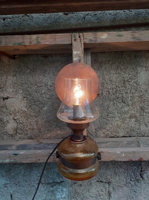 Prodaje se električna zidna lampa u obliku petrolejske lampe visine cca 31 cm. Staklena tuba/šrim unutar koje je žarulja nije originalna već je nadomjestak te vijak koji na vratu lampe služi moguće kao imitacija podizača/spuštača stinja koji gori kod pravih petrolejskih lampi moguće nema dio za okretanje. Zbog naprijed navedenog nadomjestka staklene tube koja nije originalna i nedostatka mogućeg okretača na vijku moguće imitacije podizača/spuštača stinja koji gori kod pravih petrolejskih lampi prodavatelj prodaje lampu kao oštećenu. Žarulja na slici ove lampe koja se prodaje (gdje se vidi da žarulja radi na lampi) nije uključena u prodaju. Cijena lampe je 54 eura. Mogućnost osobnog preuzimanja u Zadru. Kontakt broj prodavatelja 091 131 10 36.