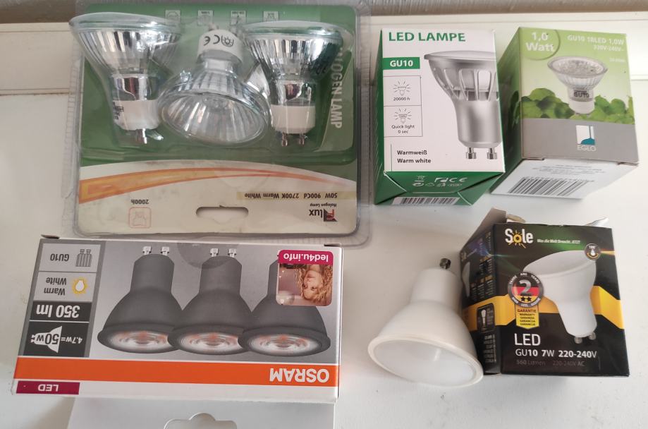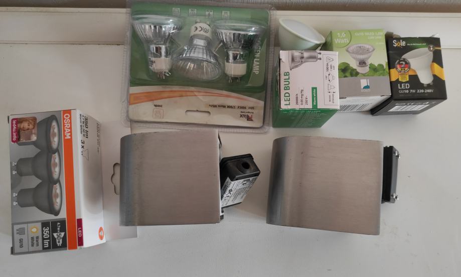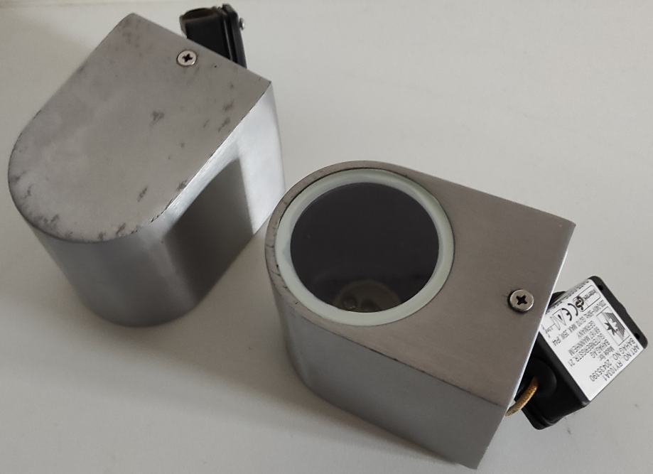 Zidni GU10 dekorativni reflektori, 2 komada sa dodatnim GU10 žaruljama, ima tragova oksidacije materijala, prodaja isključivo cijeli komplet
