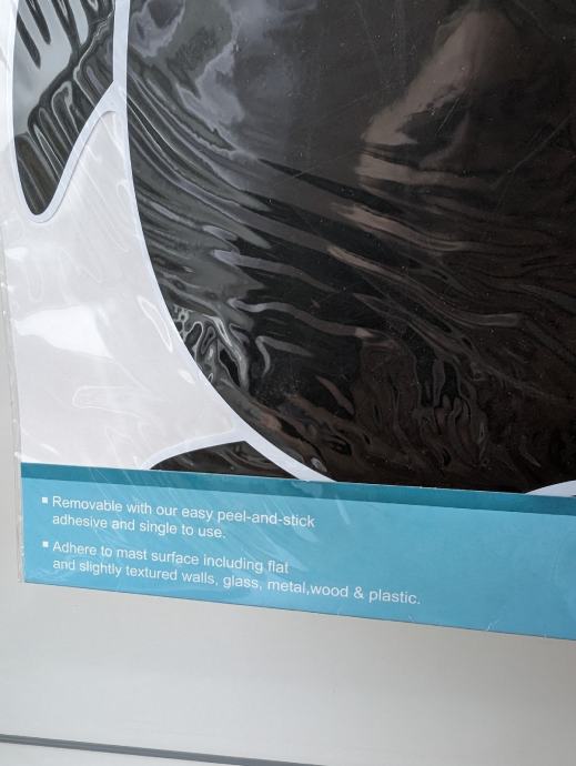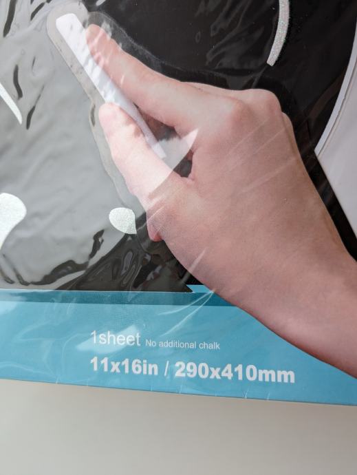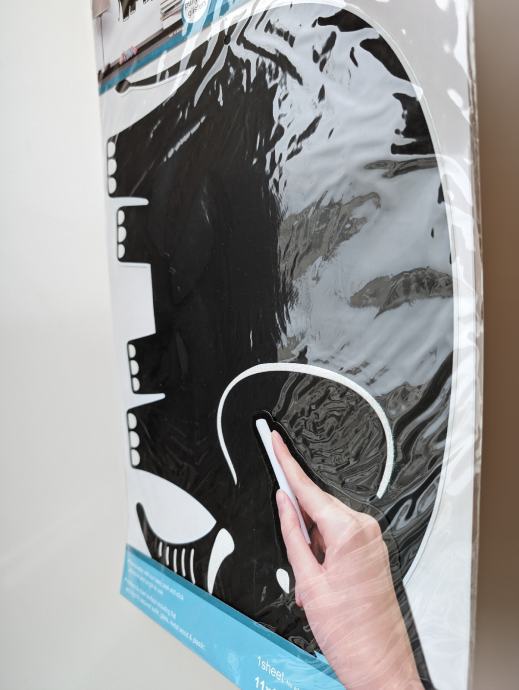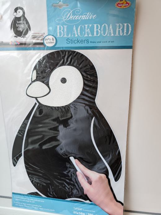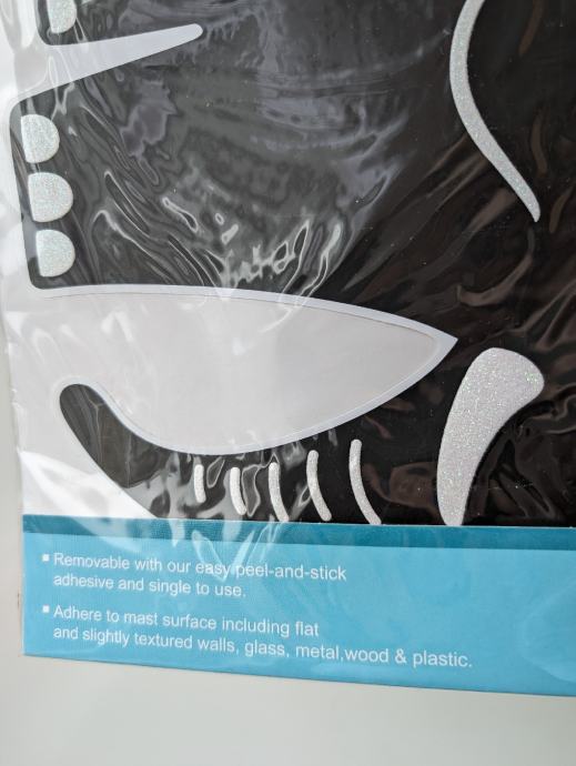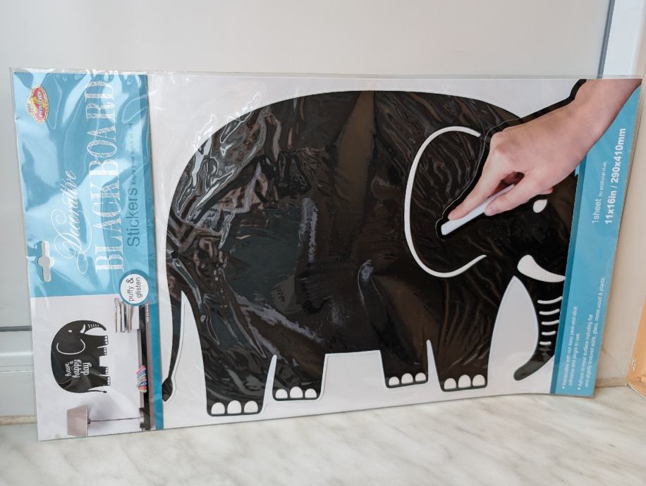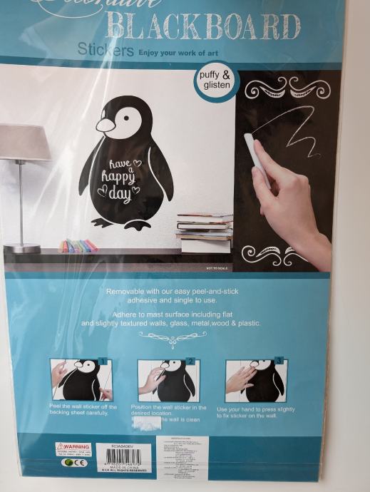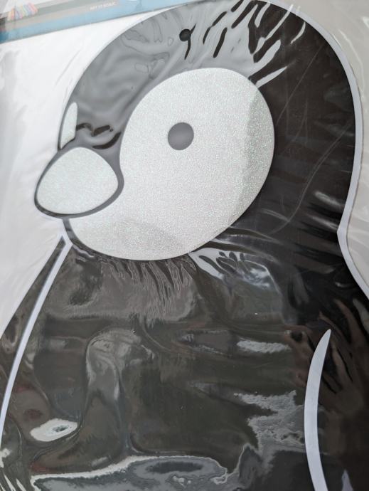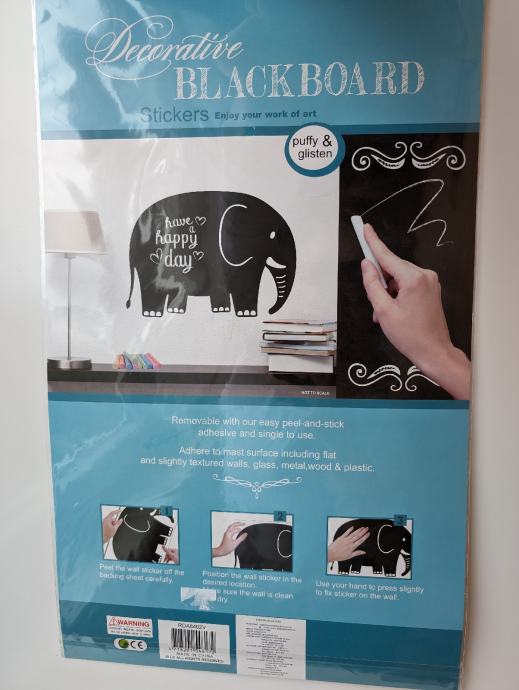 Naljepnice su pretežno crne boje, sa nekim lagano svjetlucavim detaljima, po njima je moguće pisanje ili crtanje, može se lako obrisati, jedna ima oblik slona, druga pingvina.