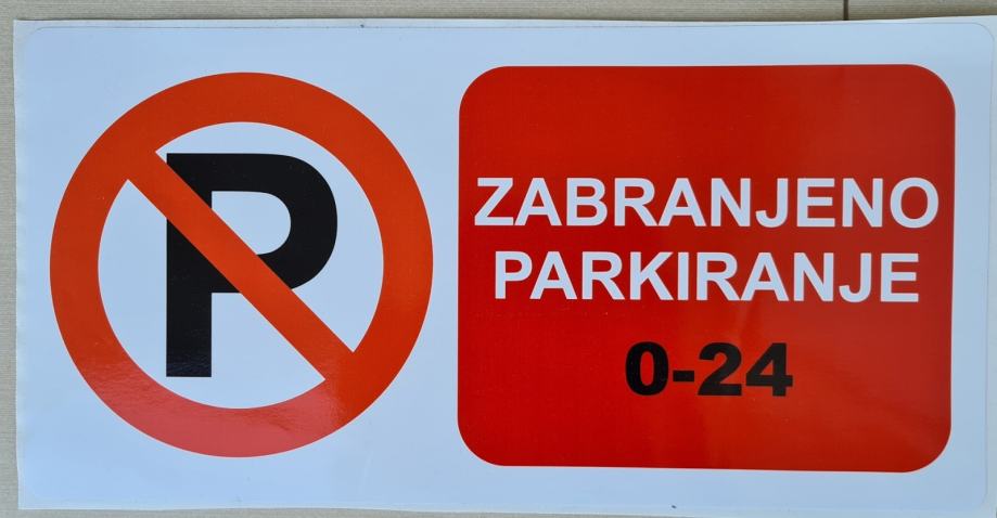 3. Naljepnica duguljasta "(P-privatno) - ZABRANJENO PARKIRANJE 0-24" na trećoj slici ima dimenzije: 20cm x 40cm.